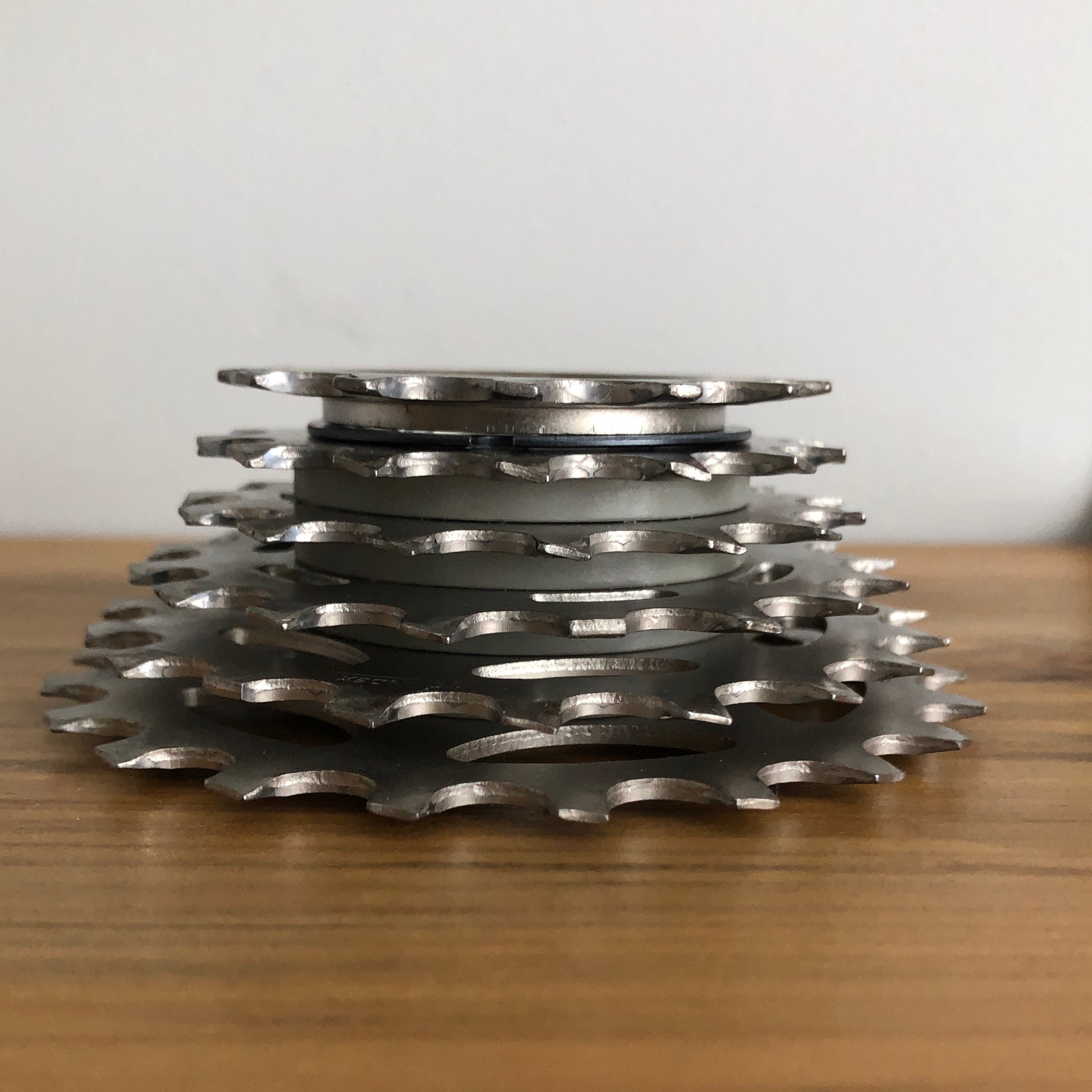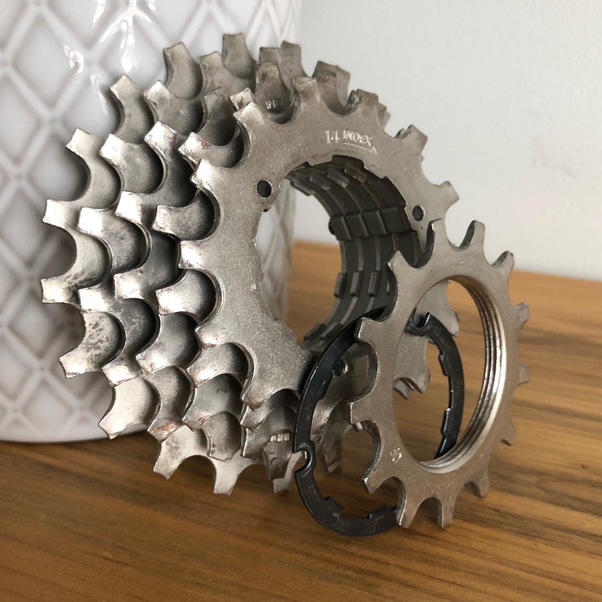 This was quite a little find on a low end road bike that was given to me. It was converted to a Triathlon bike by the owner and this cassette was part of that conversion. There are few markings on the cogs, only the teeth # and "index". The range is 13-14-15-17-9-21.