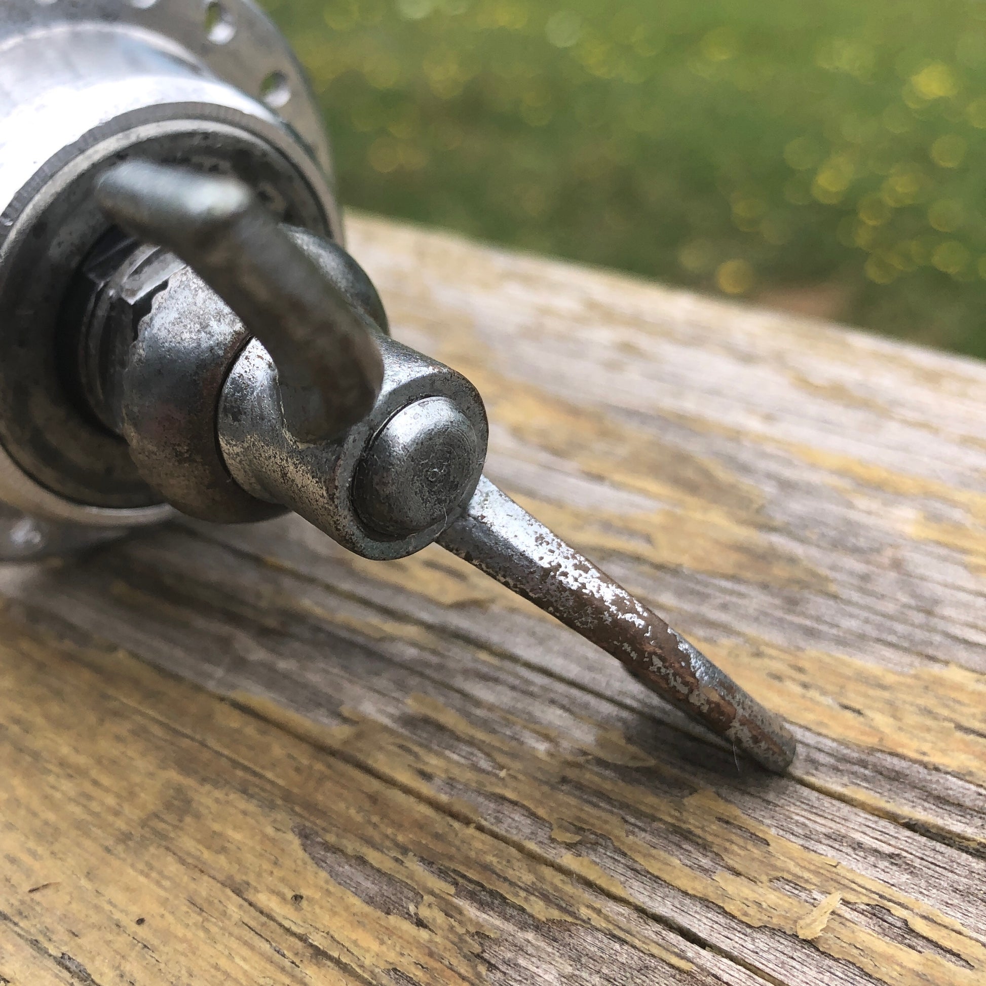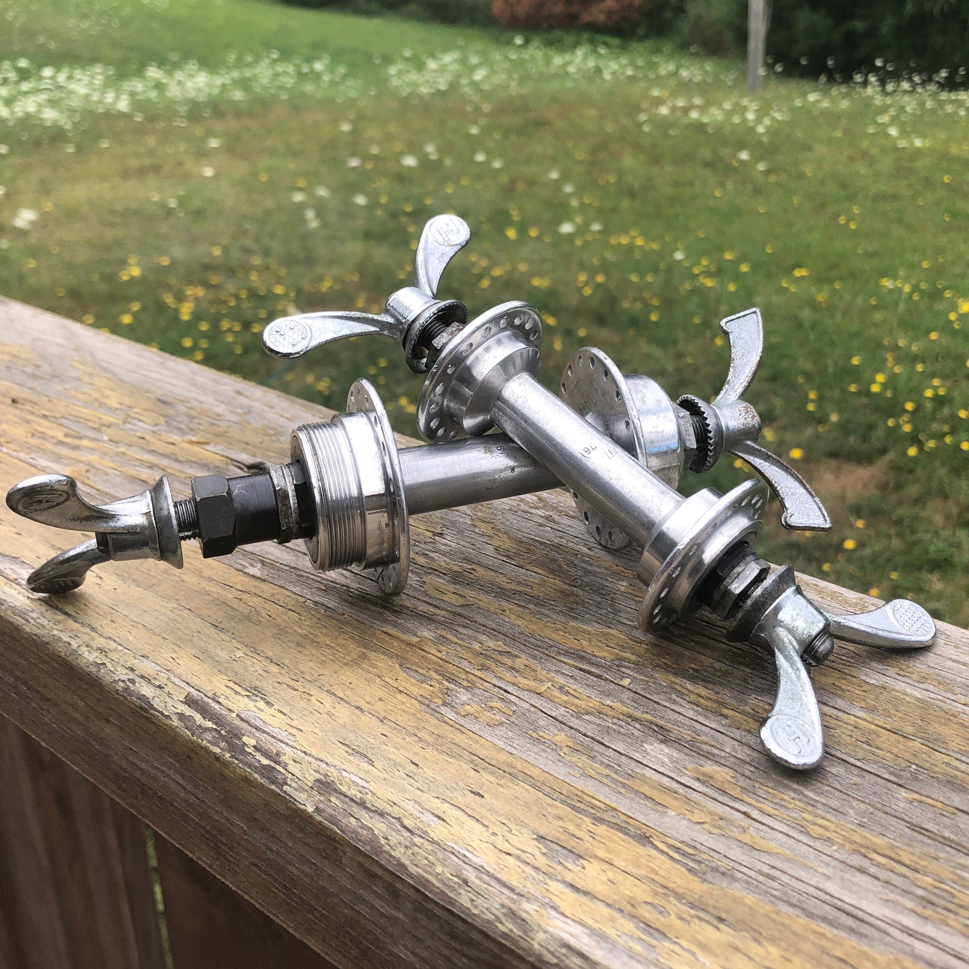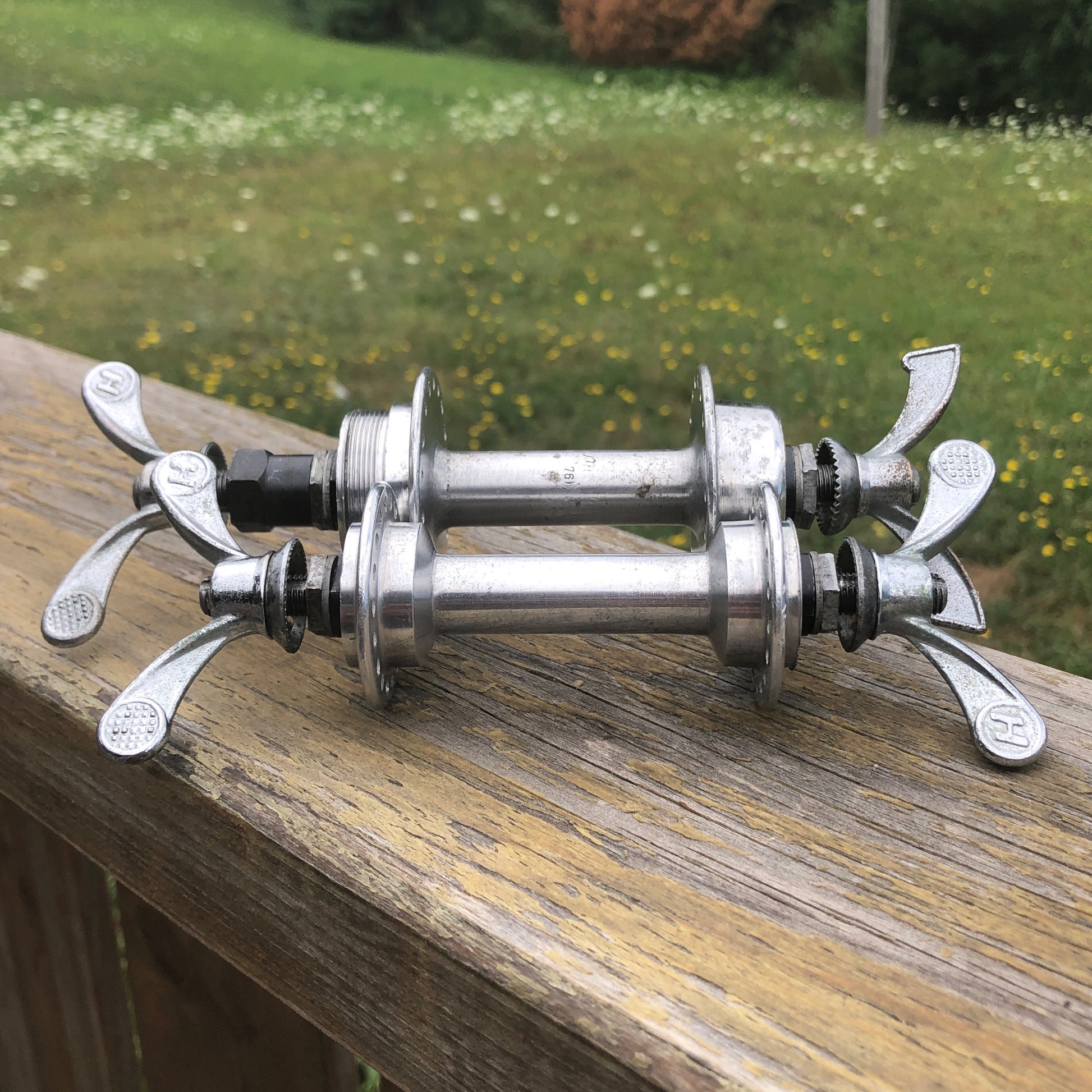 The front hub currently has a matching set of Huret wing nuts and the rear has one Huret and one Marcel/Luxe. These often are sold separately and are reflected in the price. If you would like the hubs sans la wing-nuts, just send an email.