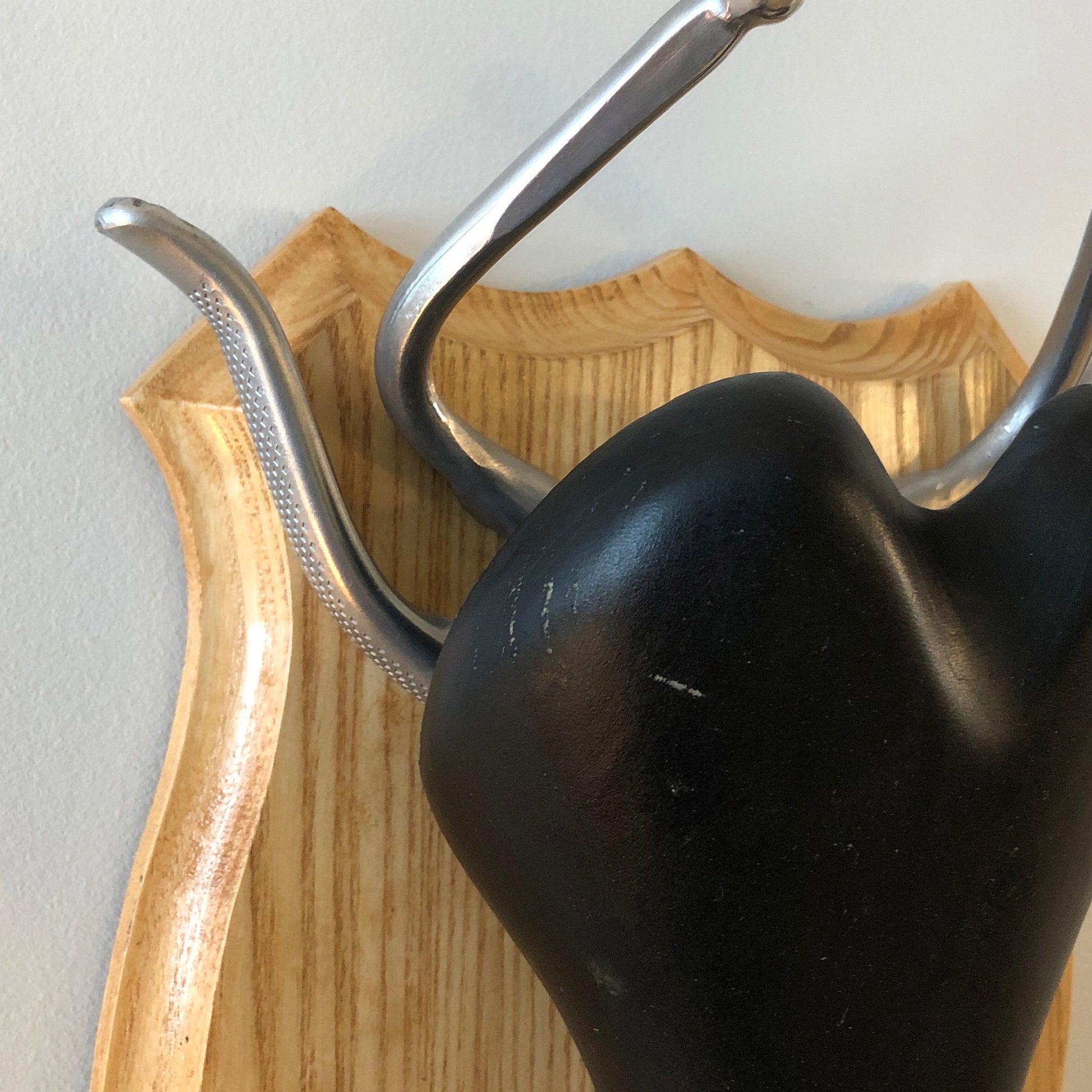 We see this species quite often at Freelander Bicycles. With its long narrow snout and the medially curving horn blade with a shorter "prong" emerging about midway. There is an abrasion (scuff or scar) on the snout likely from encounter with a fence or barricade. A simple, elegant mount, the pronghorn will constantly remind you of those days in the saddle riding the open plains.