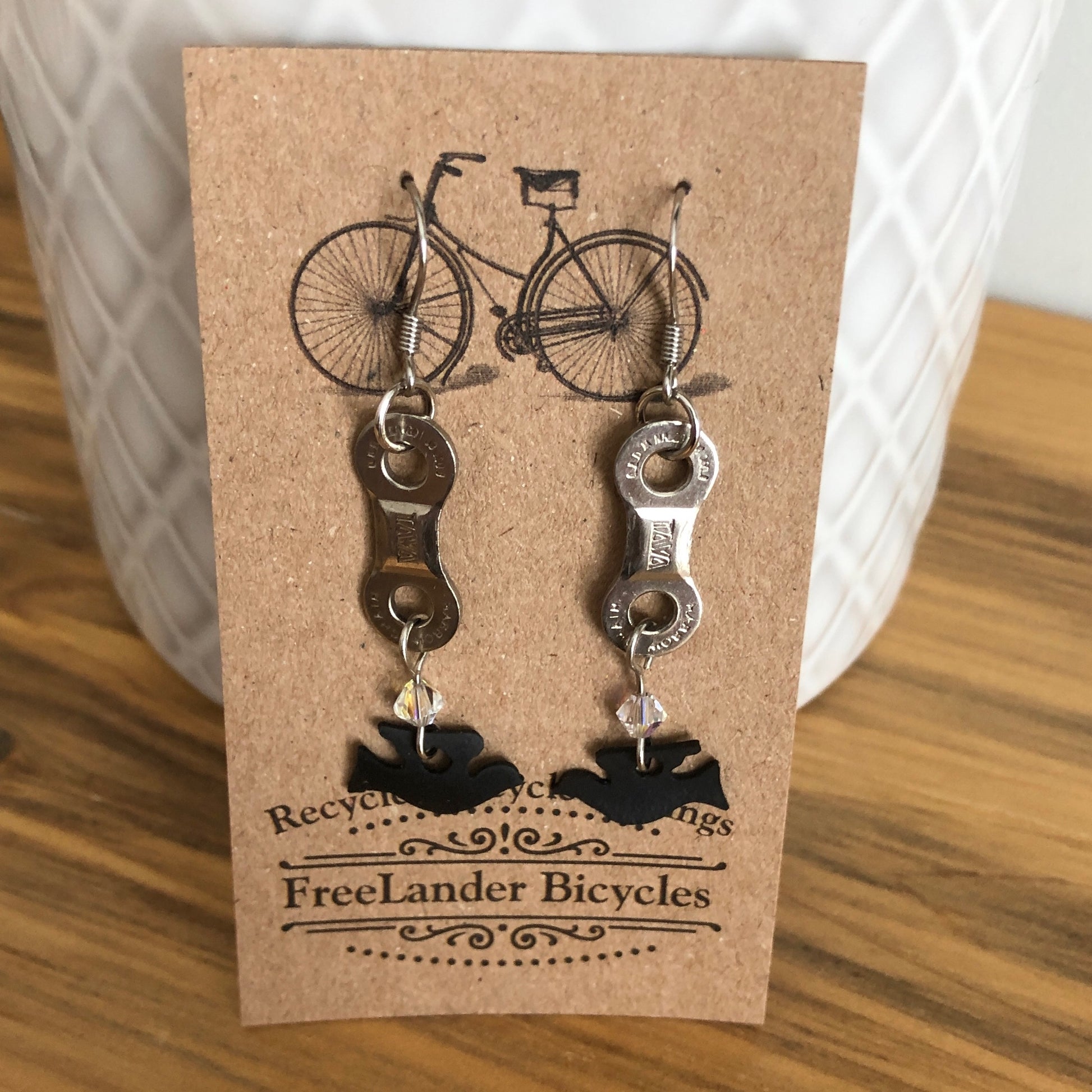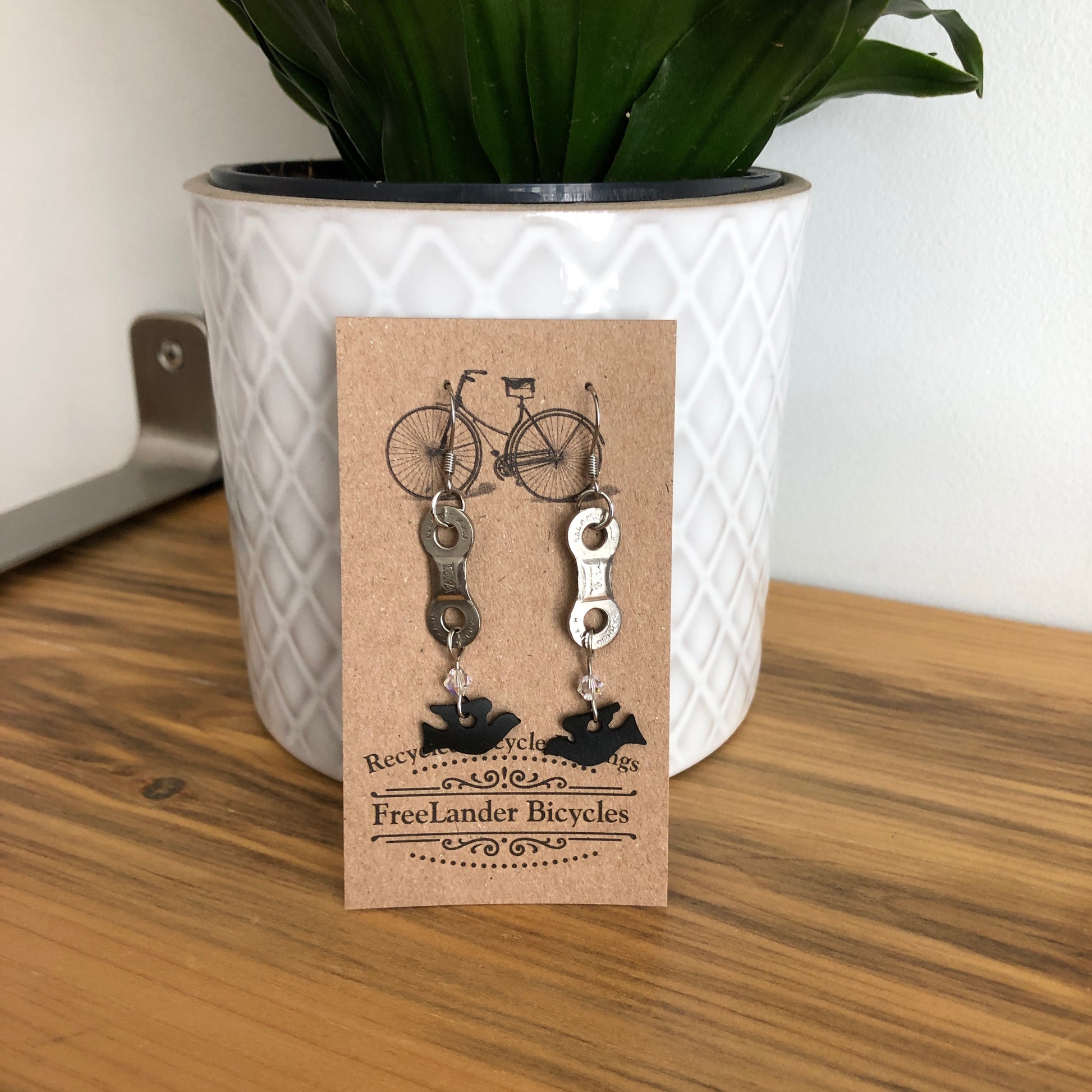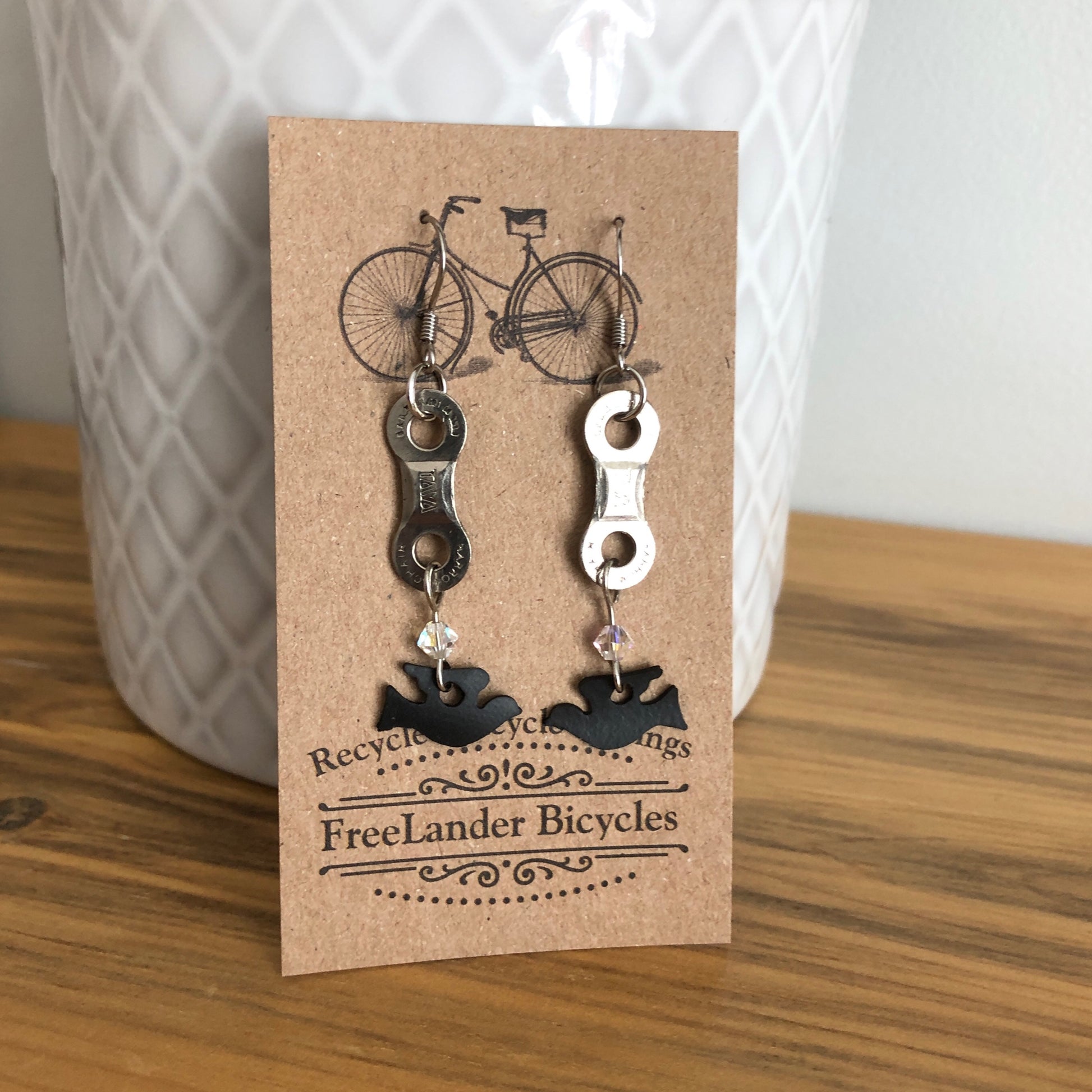 Each earring is handmade from a single silver bicycle chain link and a dove punched from recycled inner tube. Double the bicycle goodness. These earrings measure 55 mm (~2.25") from the arc of the fish hook ear wire. The findings (hooks, wires, etc.) are nickel free.