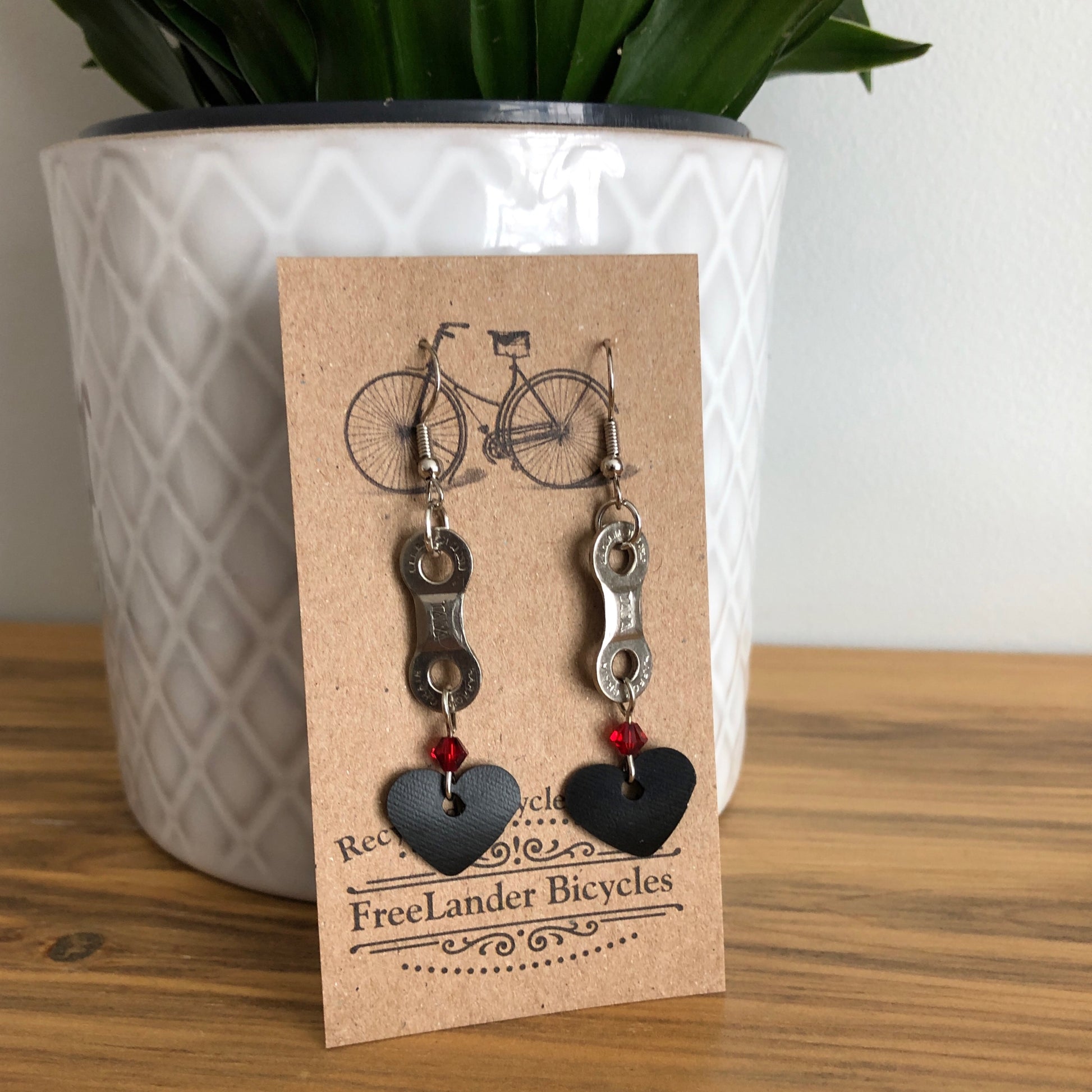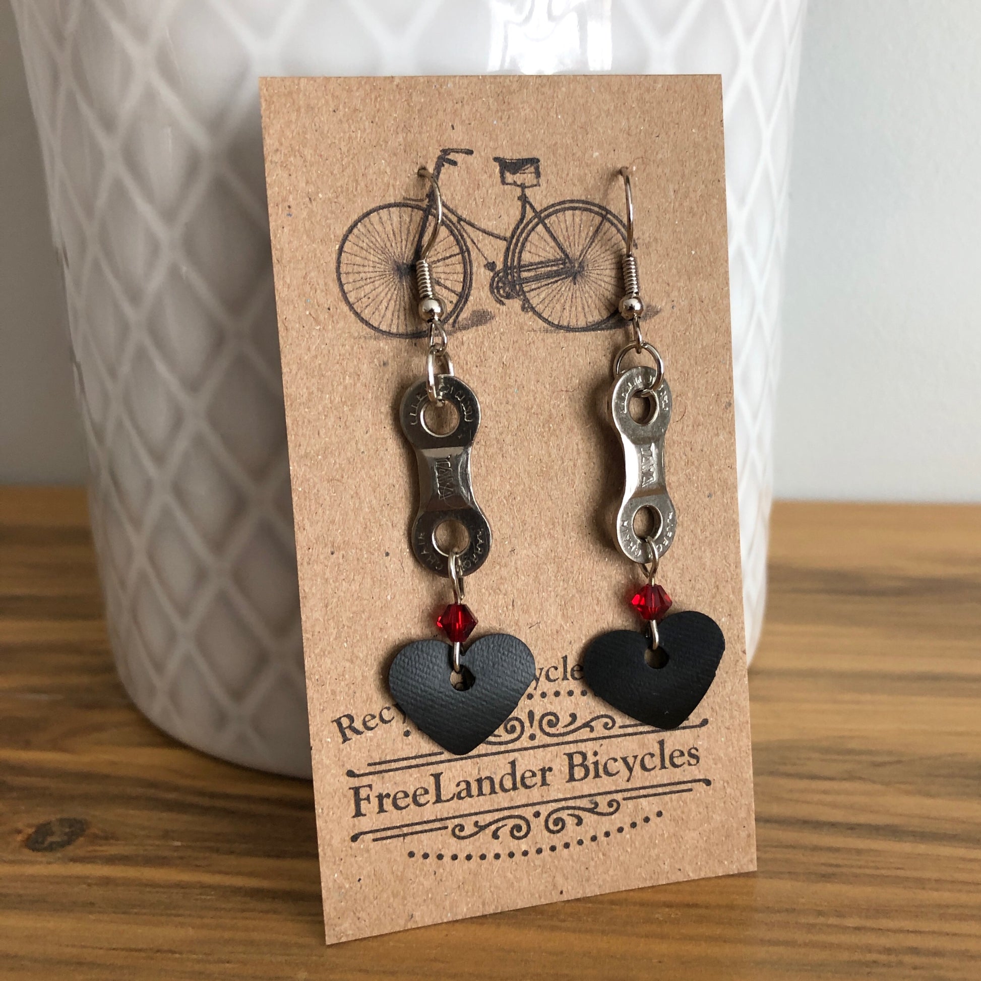 Each earring is handmade from a single silver bicycle chain link and a Heart punched from recycled inner tube. Double the bicycle goodness. These earrings measure 60 mm (~2 3/8") from the arc of the fish hook ear wire. The findings (hooks, wires, etc.) are nickel free.