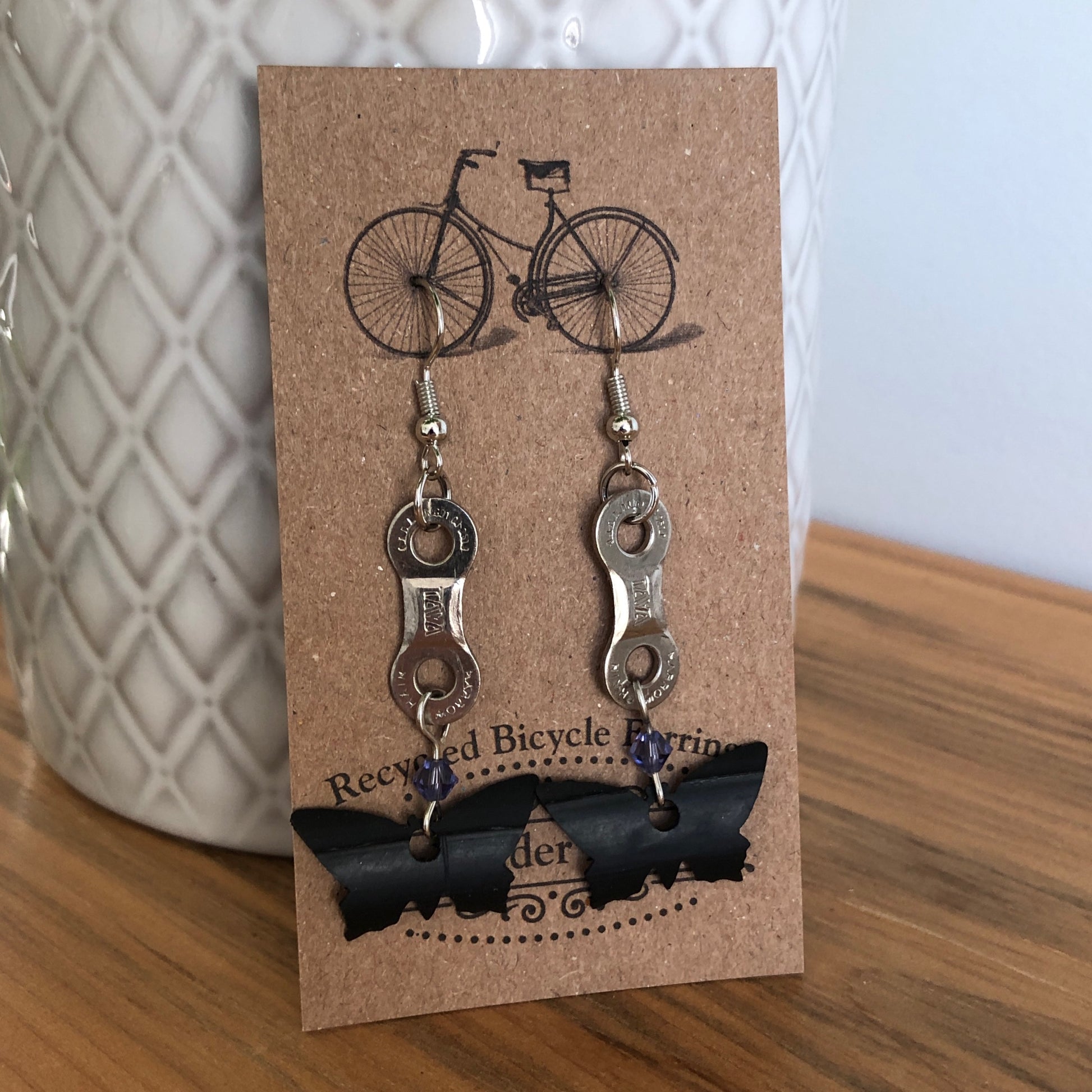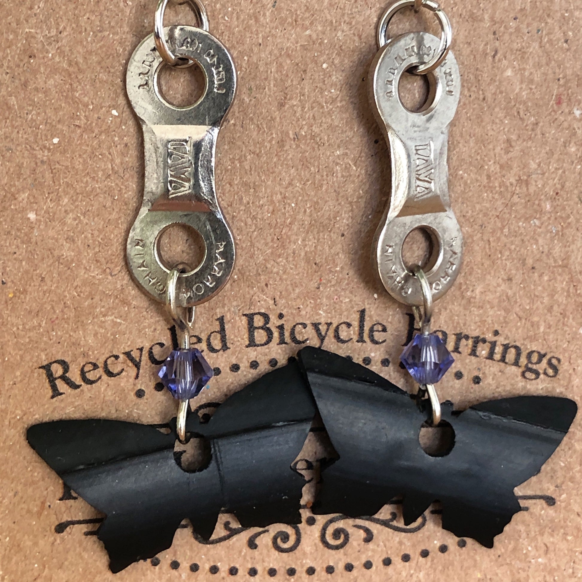 Each earring is handmade from a single silver bicycle chain link and a butterfly punched from recycled inner tube. Double the bicycle goodness. These earrings measure 55 mm (~2 1/8") from the arc of the fish hook ear wire. The findings (hooks, wires, etc.) are nickel free.