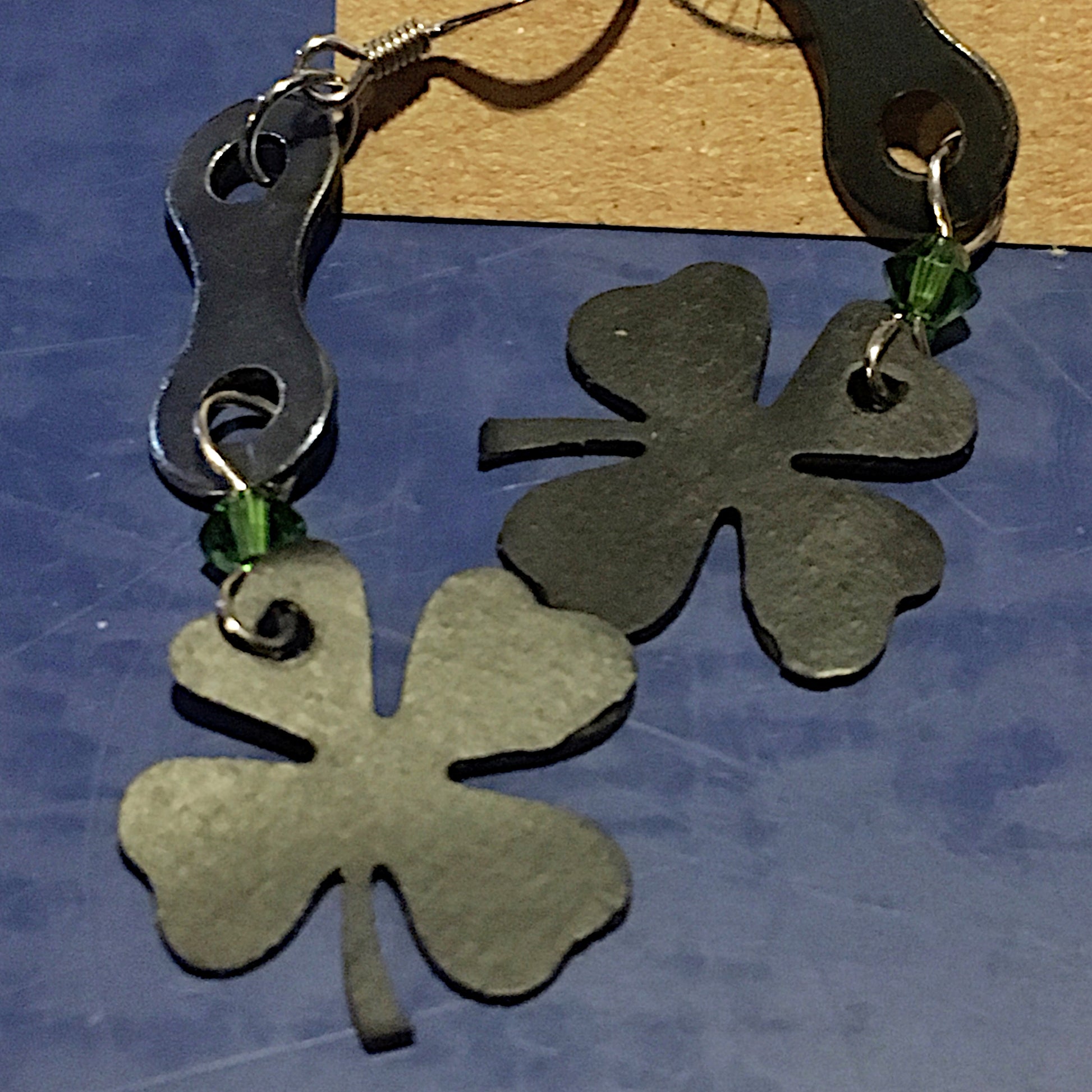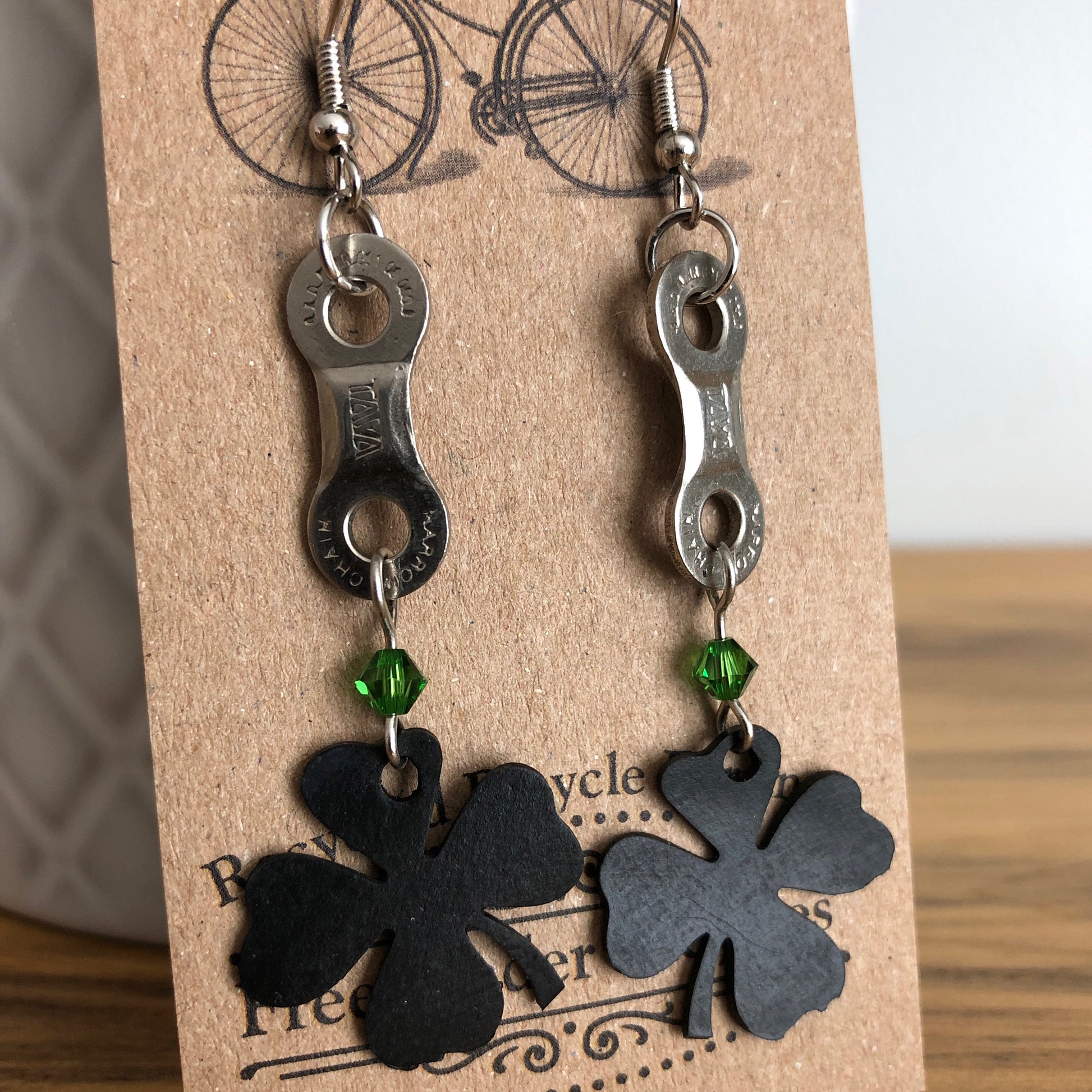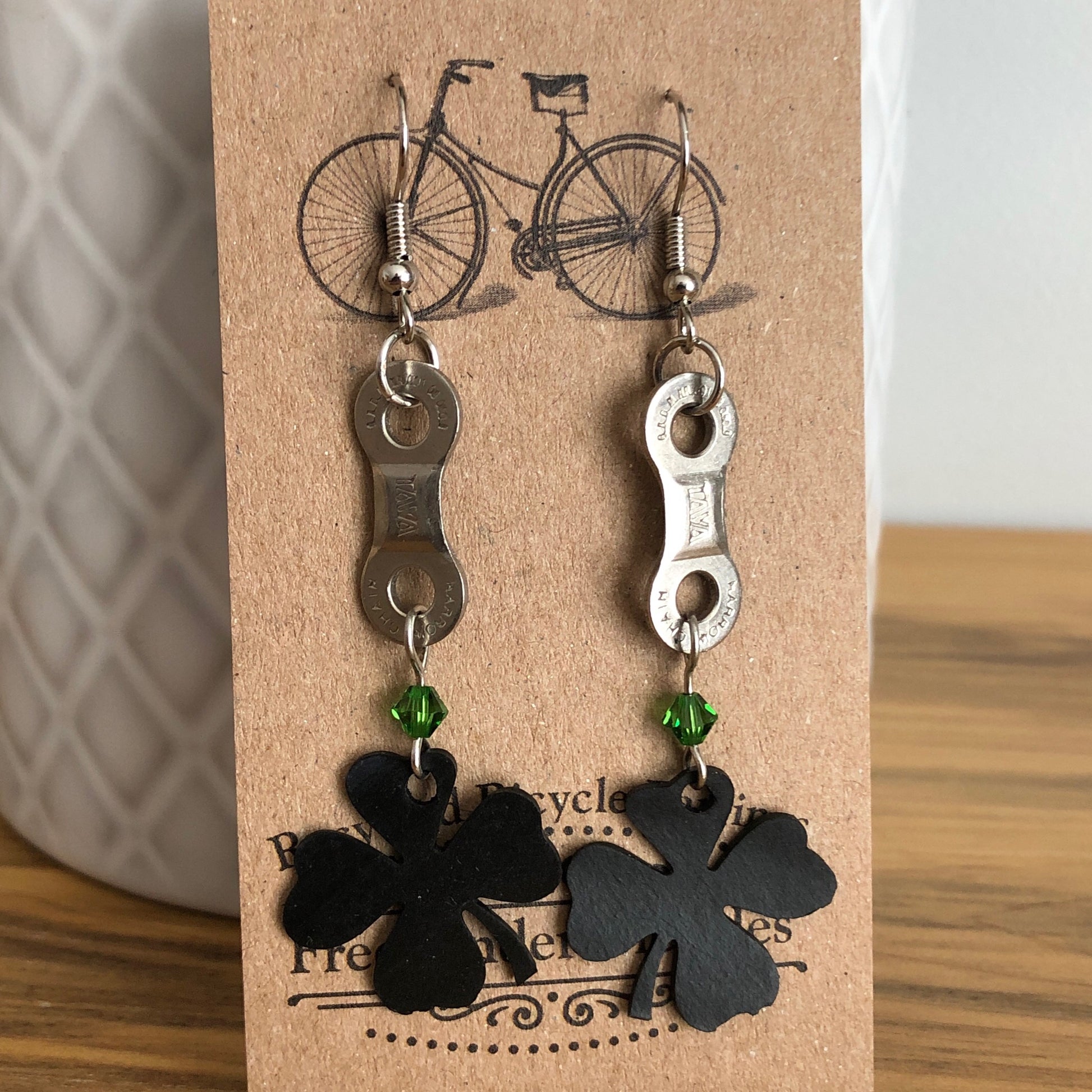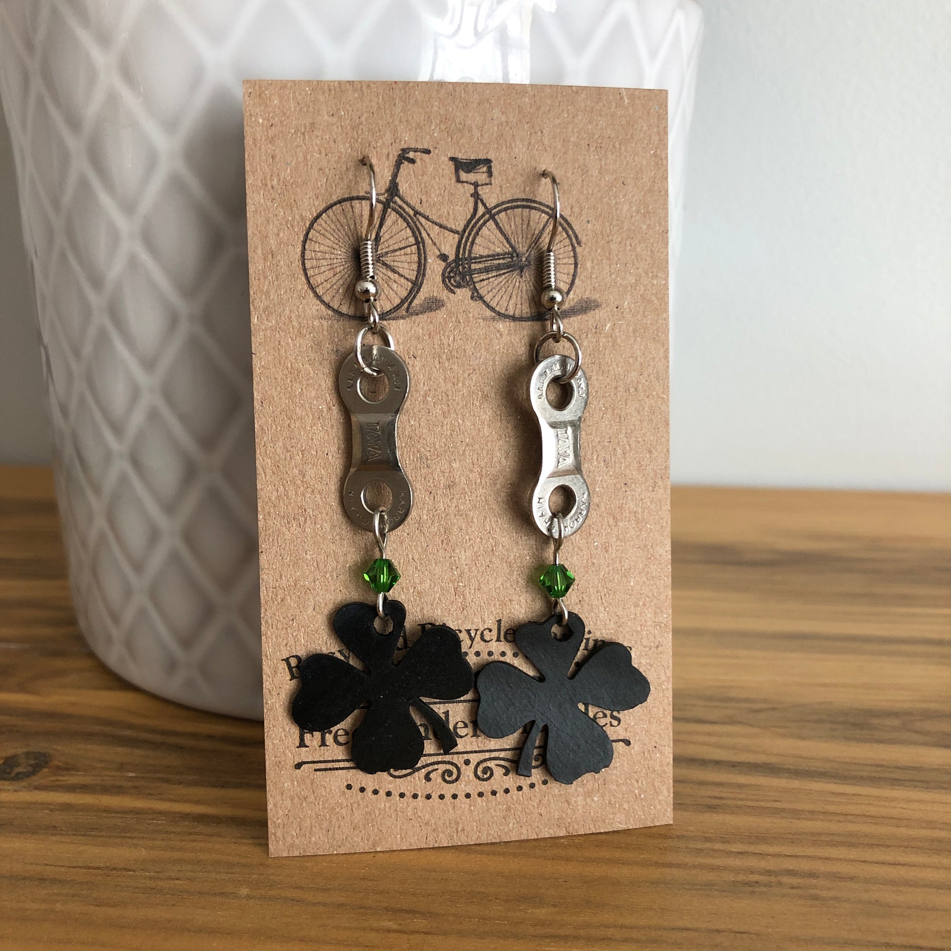 Each earring is handmade from a single silver bicycle chain link and a shamrock punched from recycled inner tube. Double the bicycle goodness. These earrings measure 70 mm (~2.75") from the arc of the fish hook ear wire. The findings (hooks, wires, etc.) are nickel free.