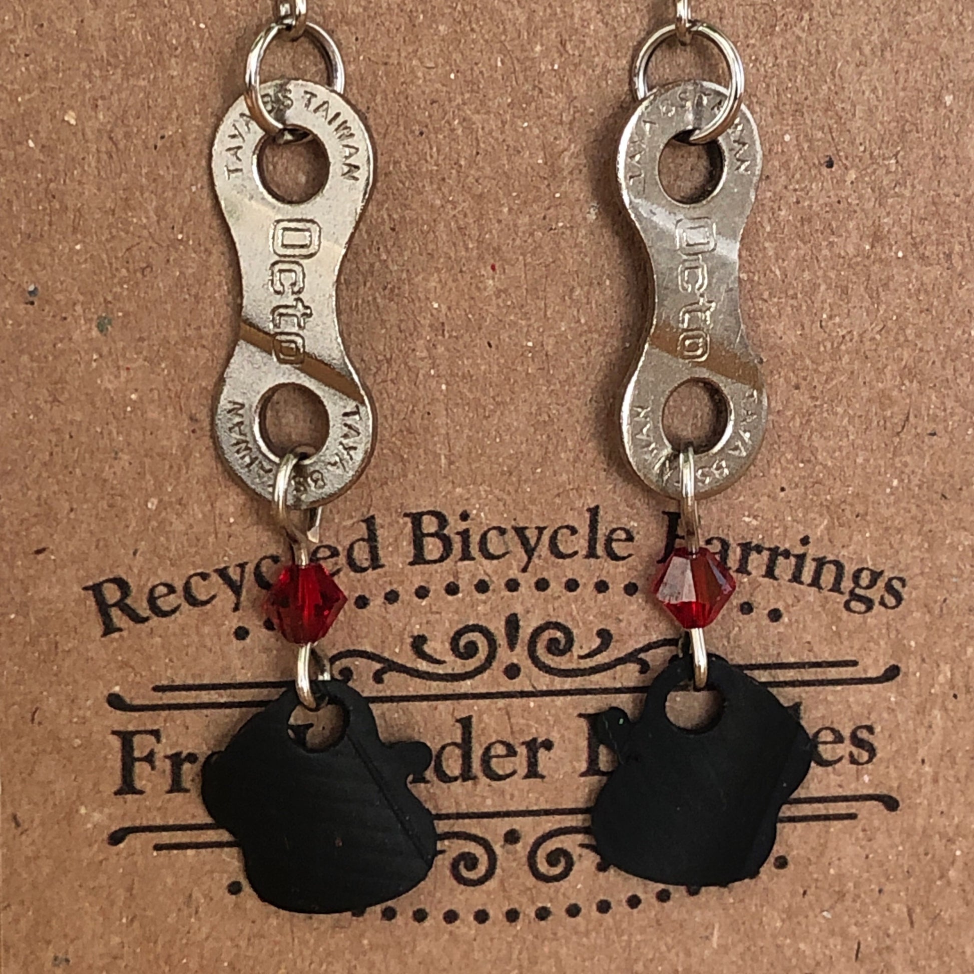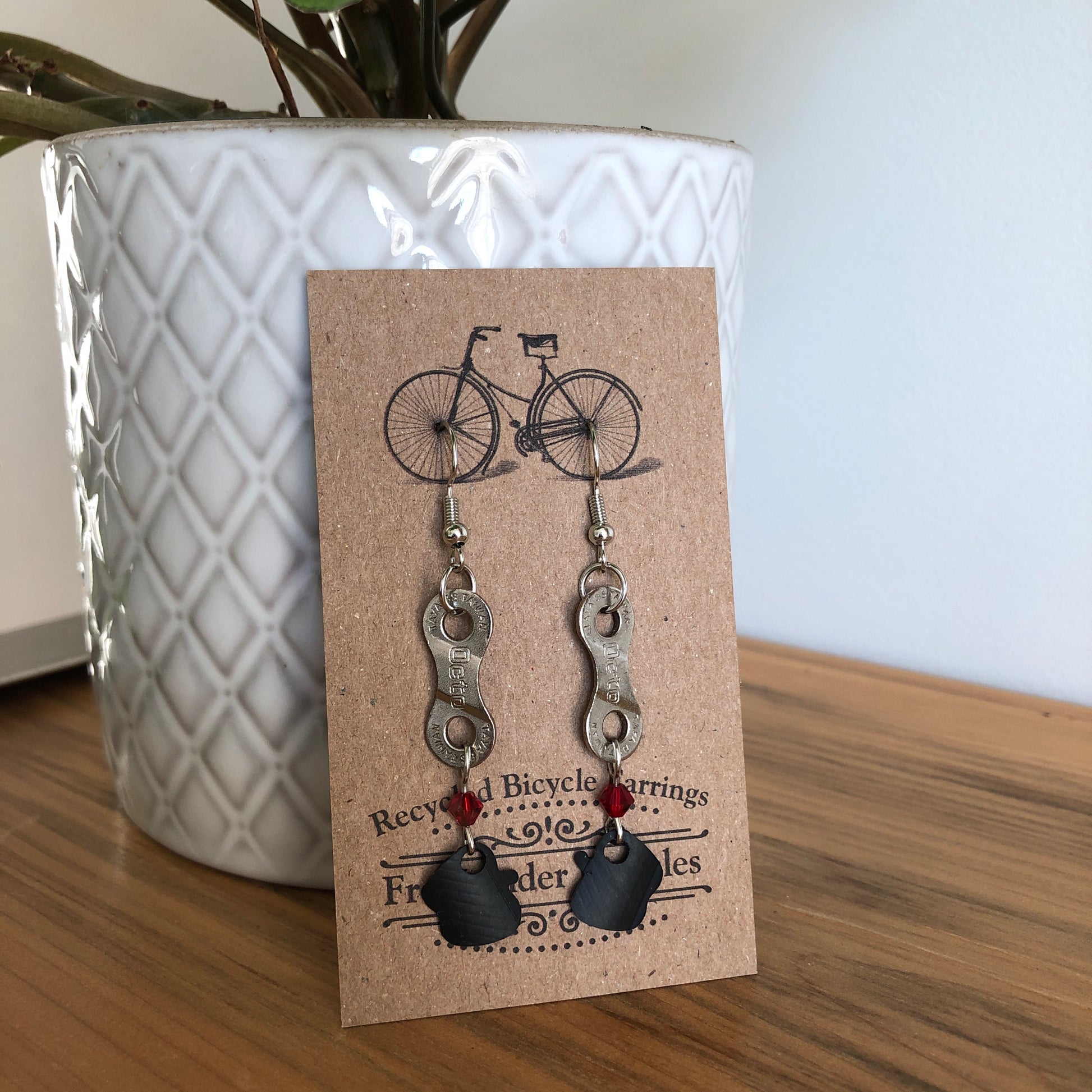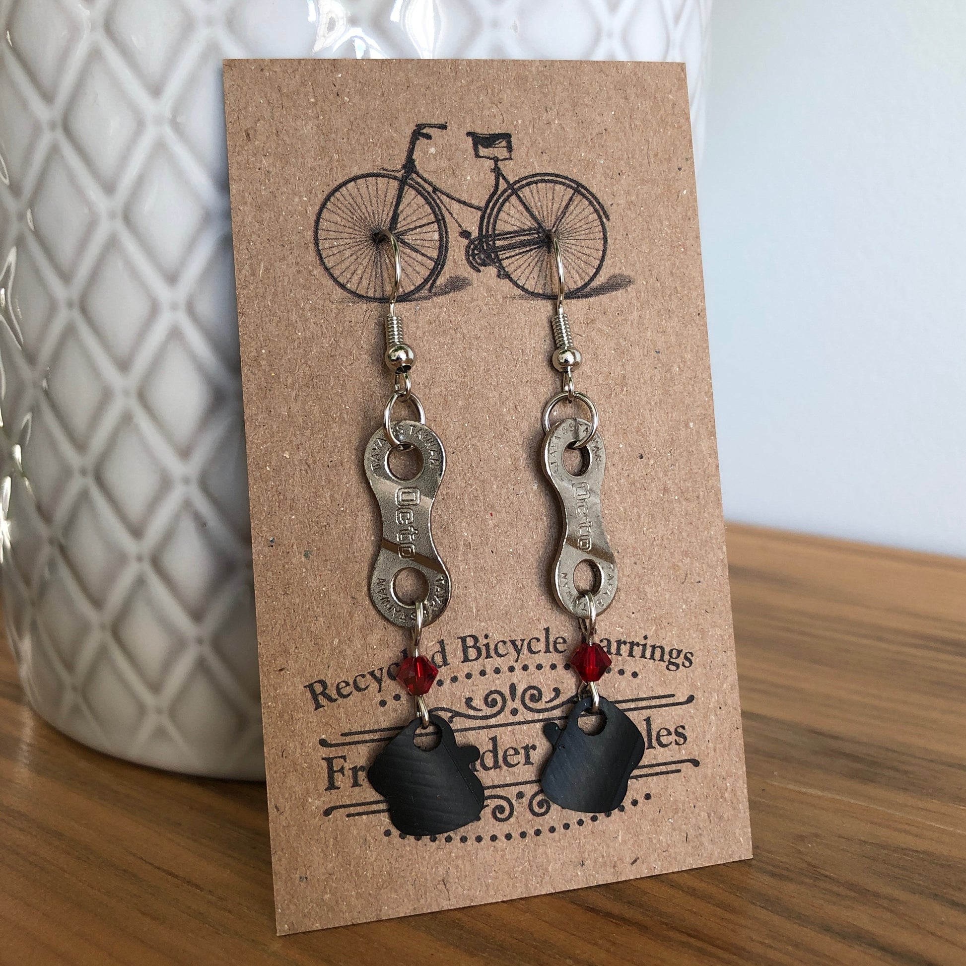Each earring is handmade from a single silver bicycle chain link and an apple punched from recycled inner tube. Double the bicycle goodness. These earrings measure 60 mm (~2 3/8") from the arc of the fish hook ear wire. The findings (hooks, wires, etc.) are nickel free.