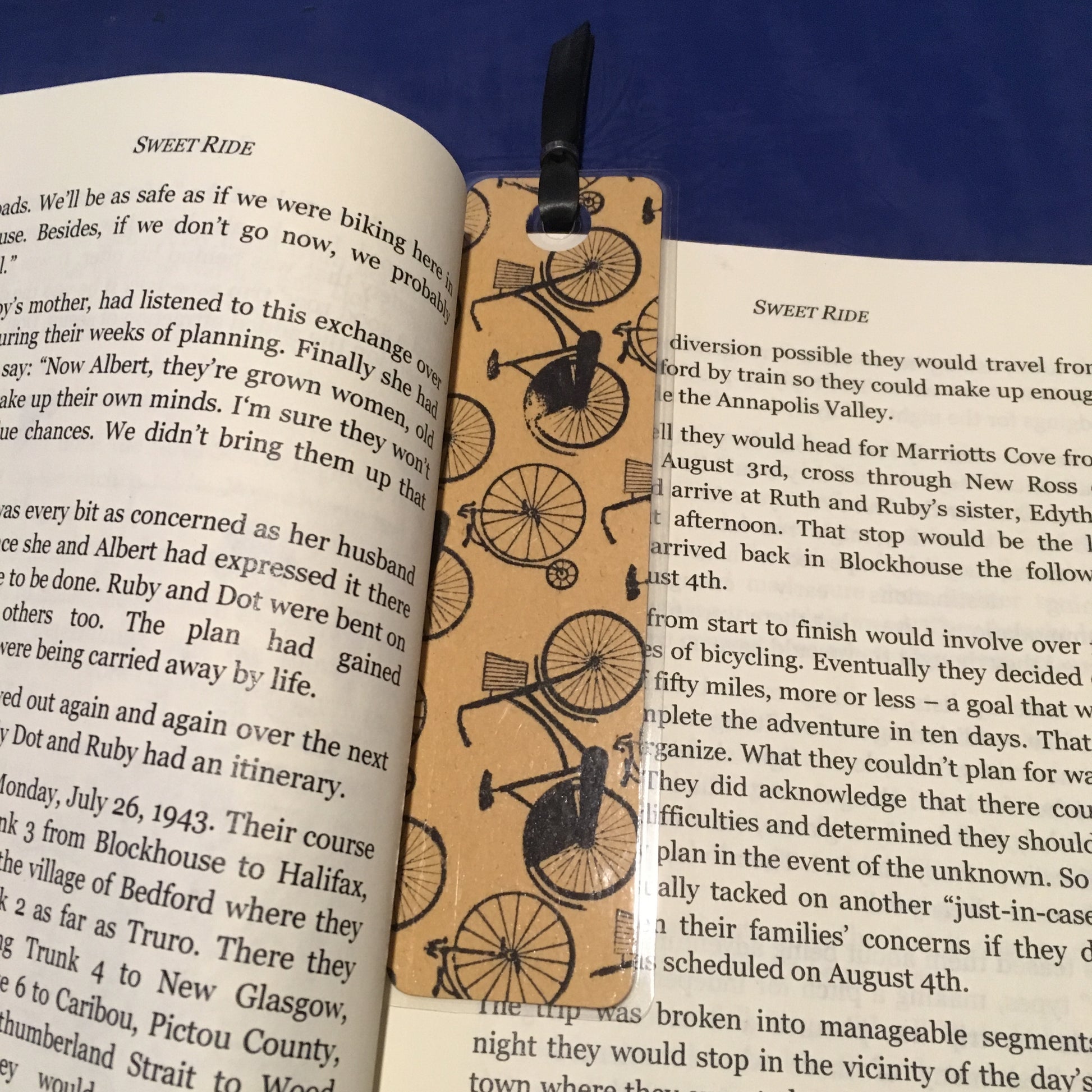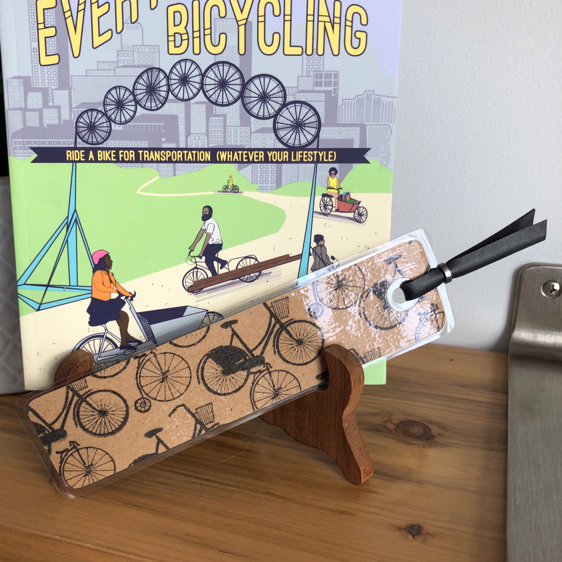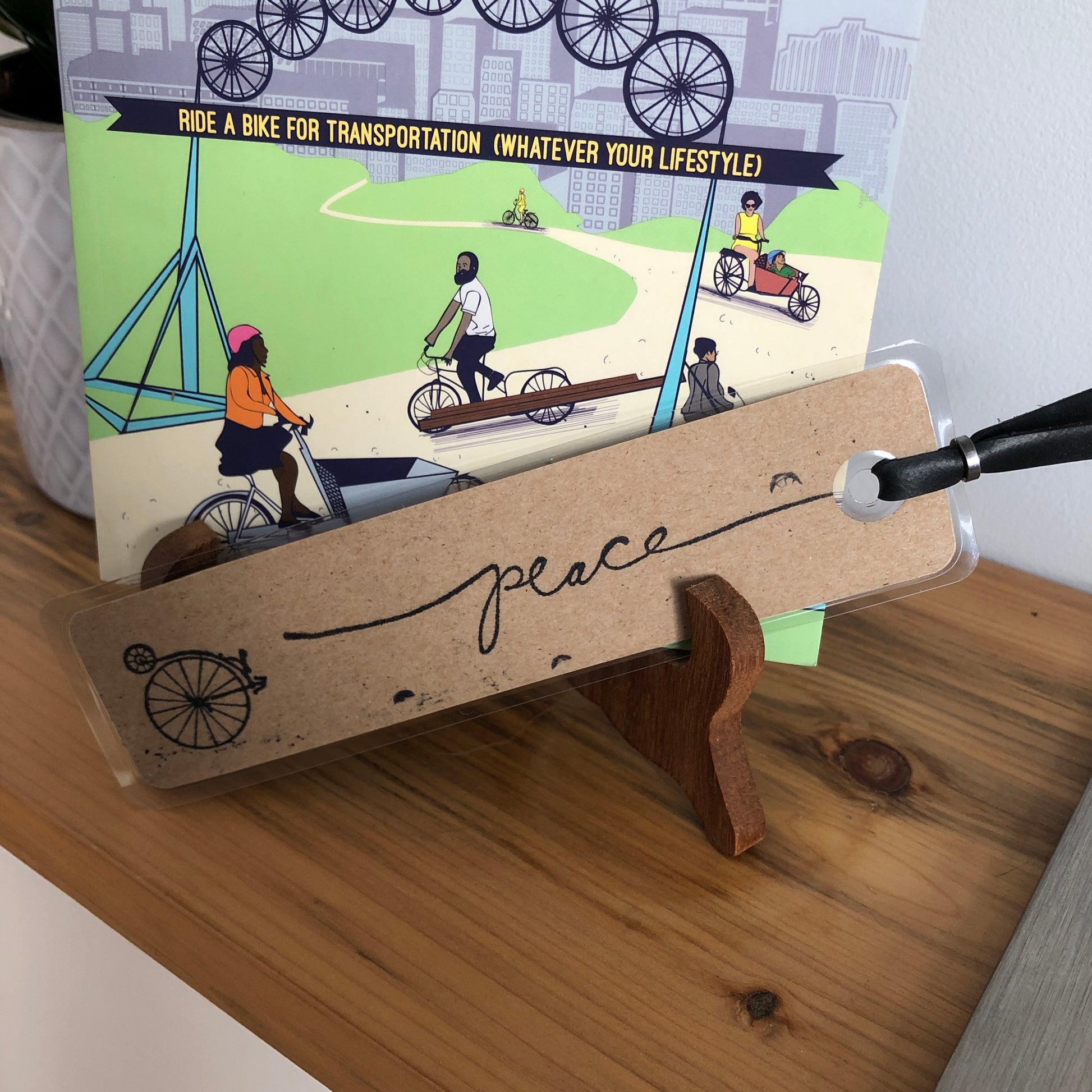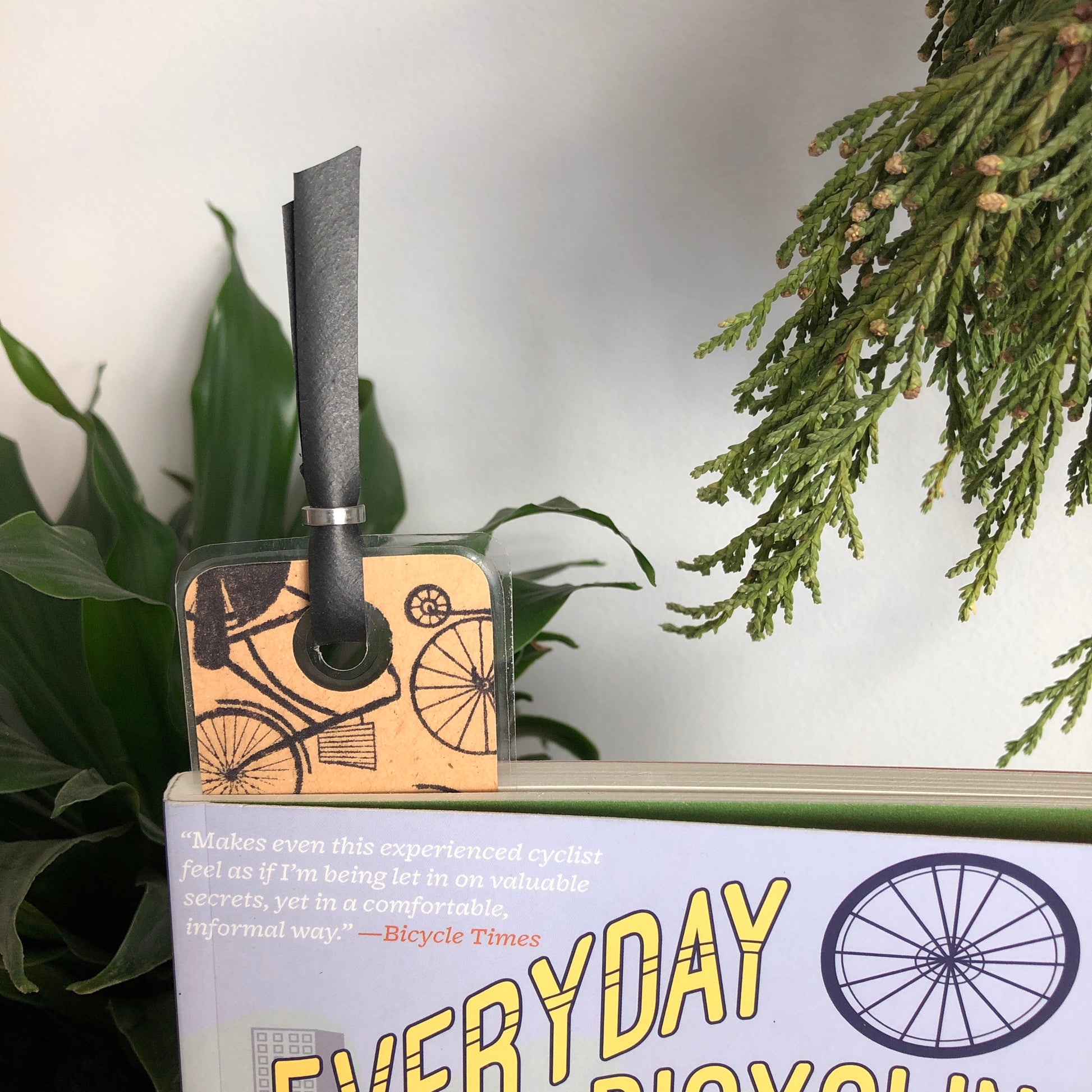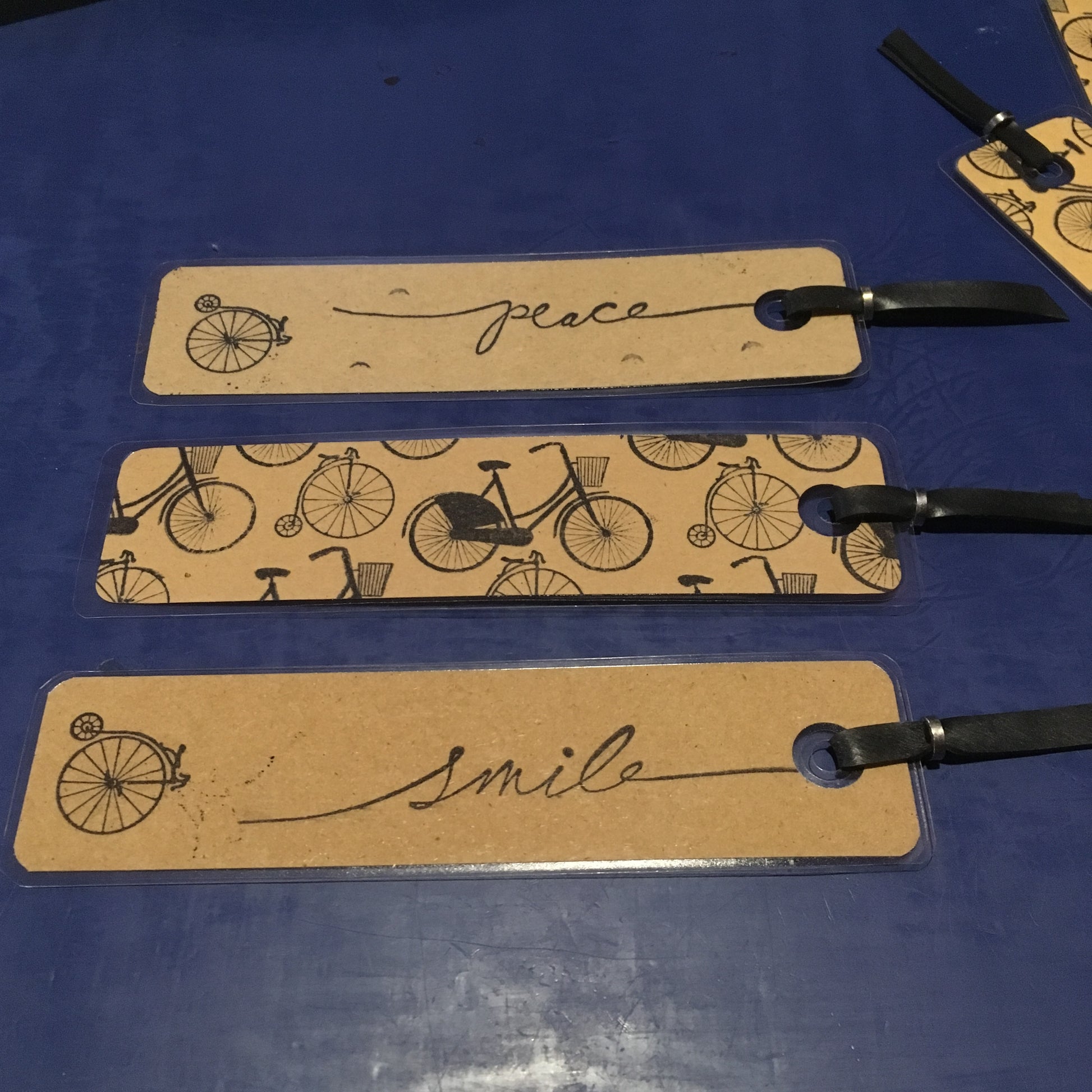Each bookmark was hand-stamped by my 14 year old "Master Crafter" daughter. She meticulously found the best arrangement for the high wheeler and the commuter. We use recycled manilla file folders and other materials whenever we can. A larger hole is punched in the bookmark before laminating so the smaller hole will not break the seal. A length of inner tube held together by a chain roller adds character.