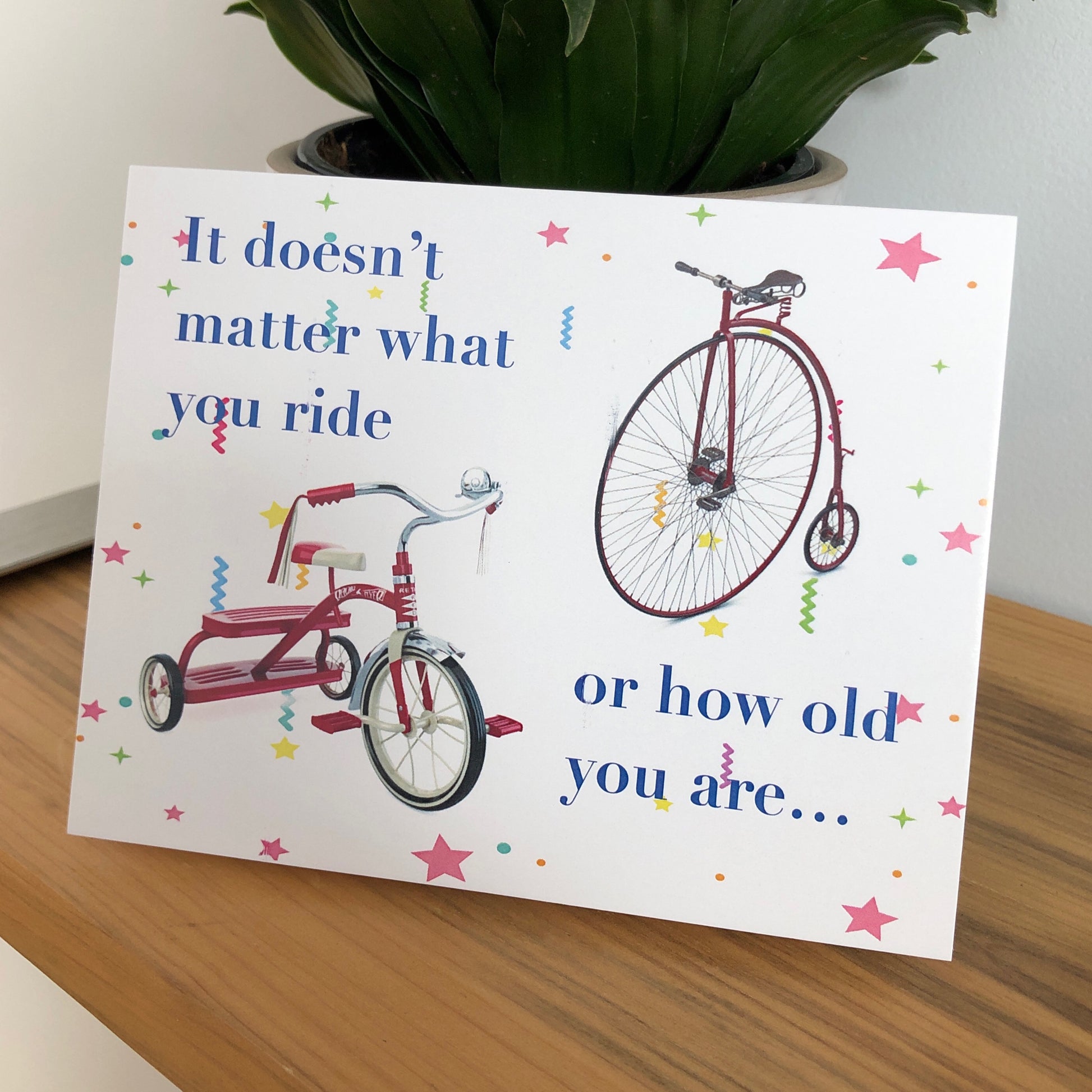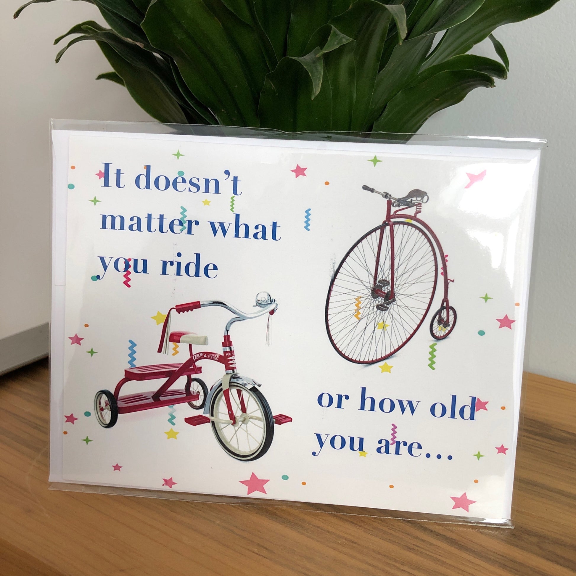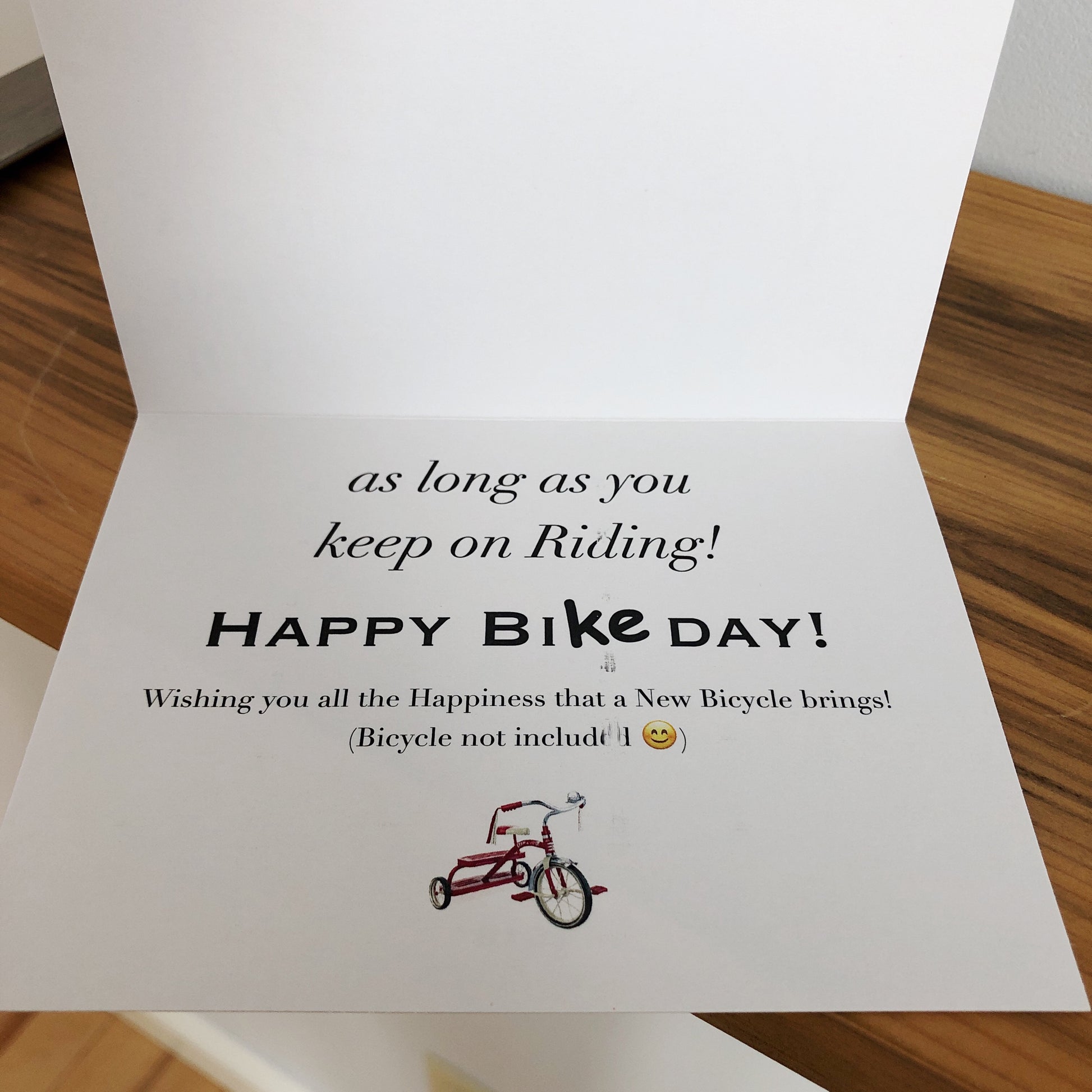 Inside: as long as you keep on riding! Happy BIKEday! Wishing you all the Happiness a New Bicycle brings (Bicycle not included)