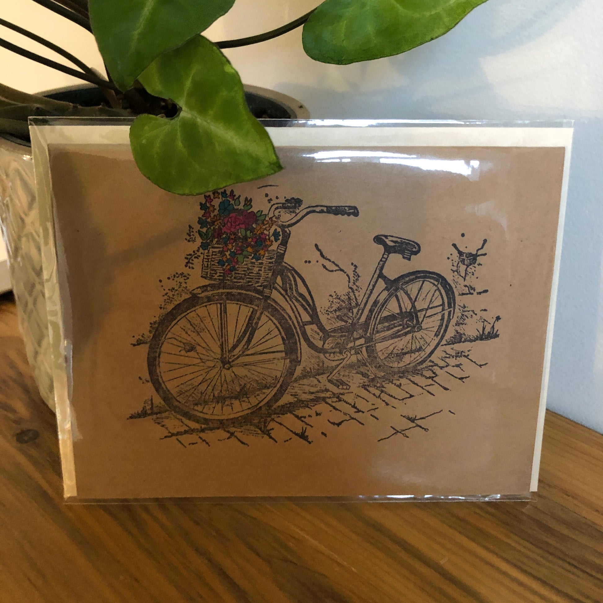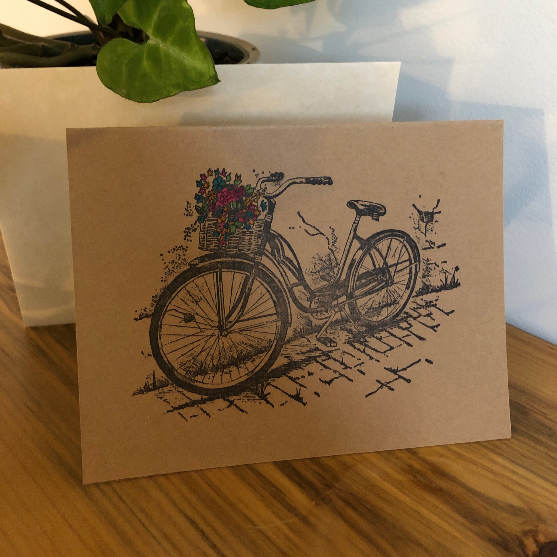 Sometimes what you want to say can't be found on the inside of a card. Something so personal that you want to author your own verse. We made these cards for just that occasion. Made from understated kraft card stock and Hand-Stamped with a vintage bicycle. The real magic is in the Hand-Coloured Flowers adorning the basket. My in-house artist/daughter meticulously coloured each one. This card will bring joy to the giver and receiver in equal measure!
