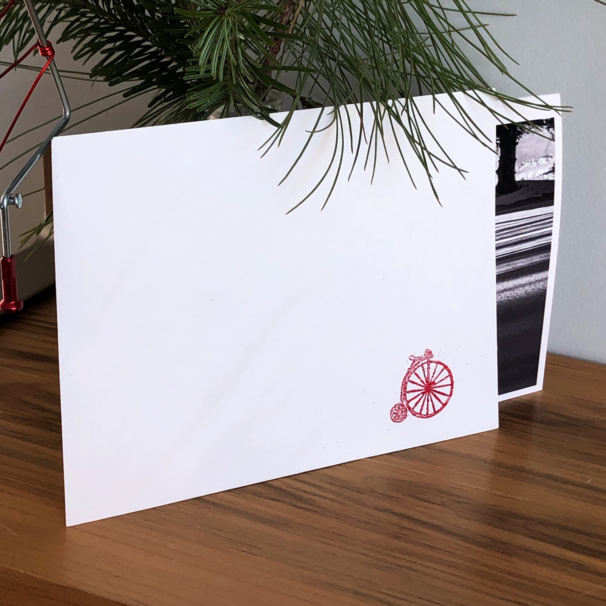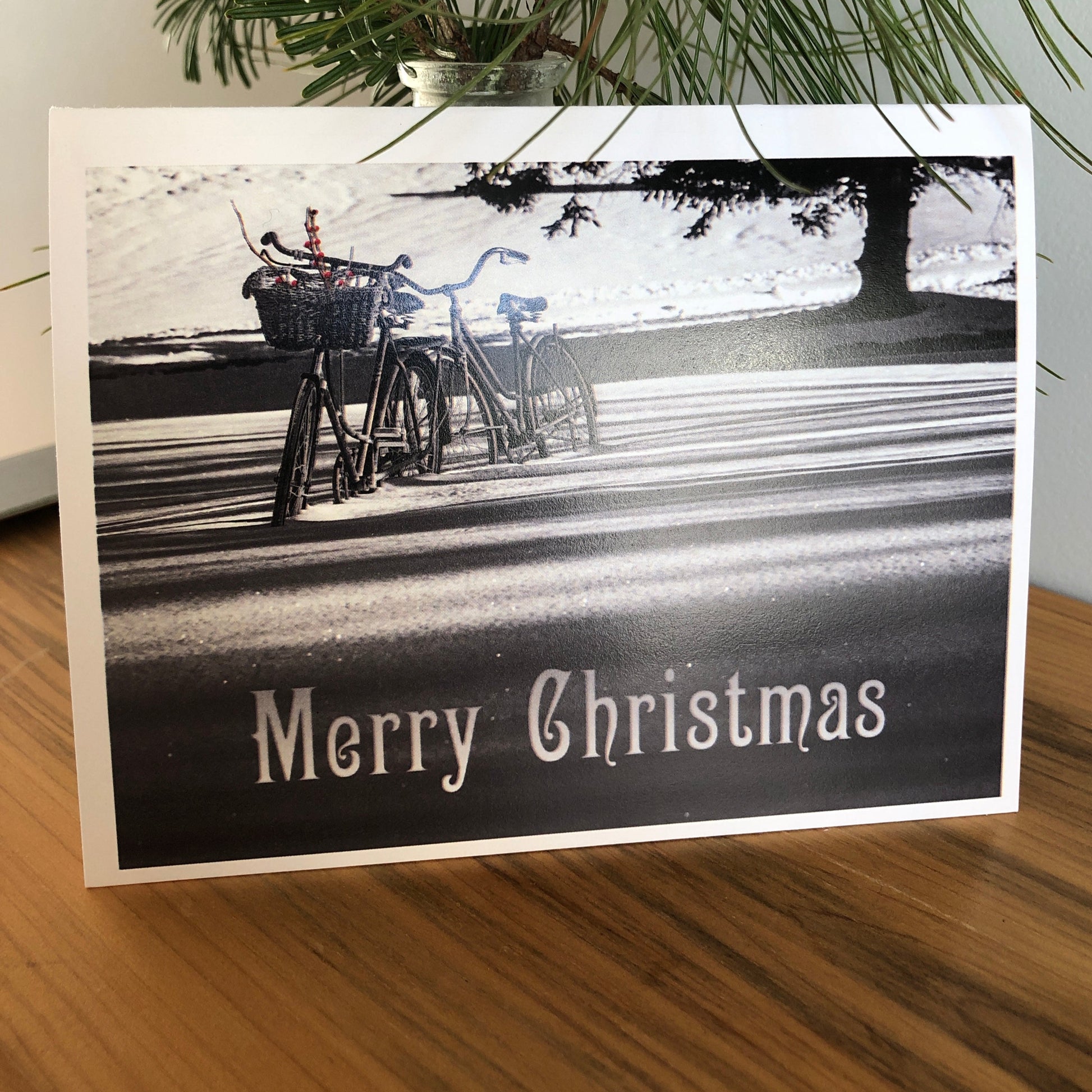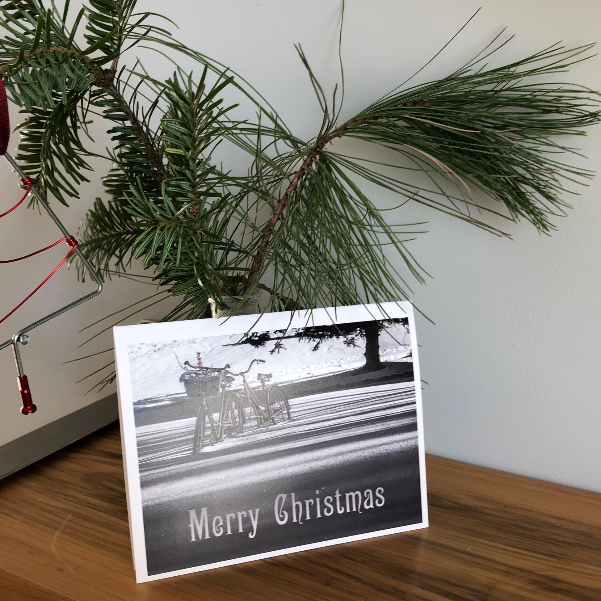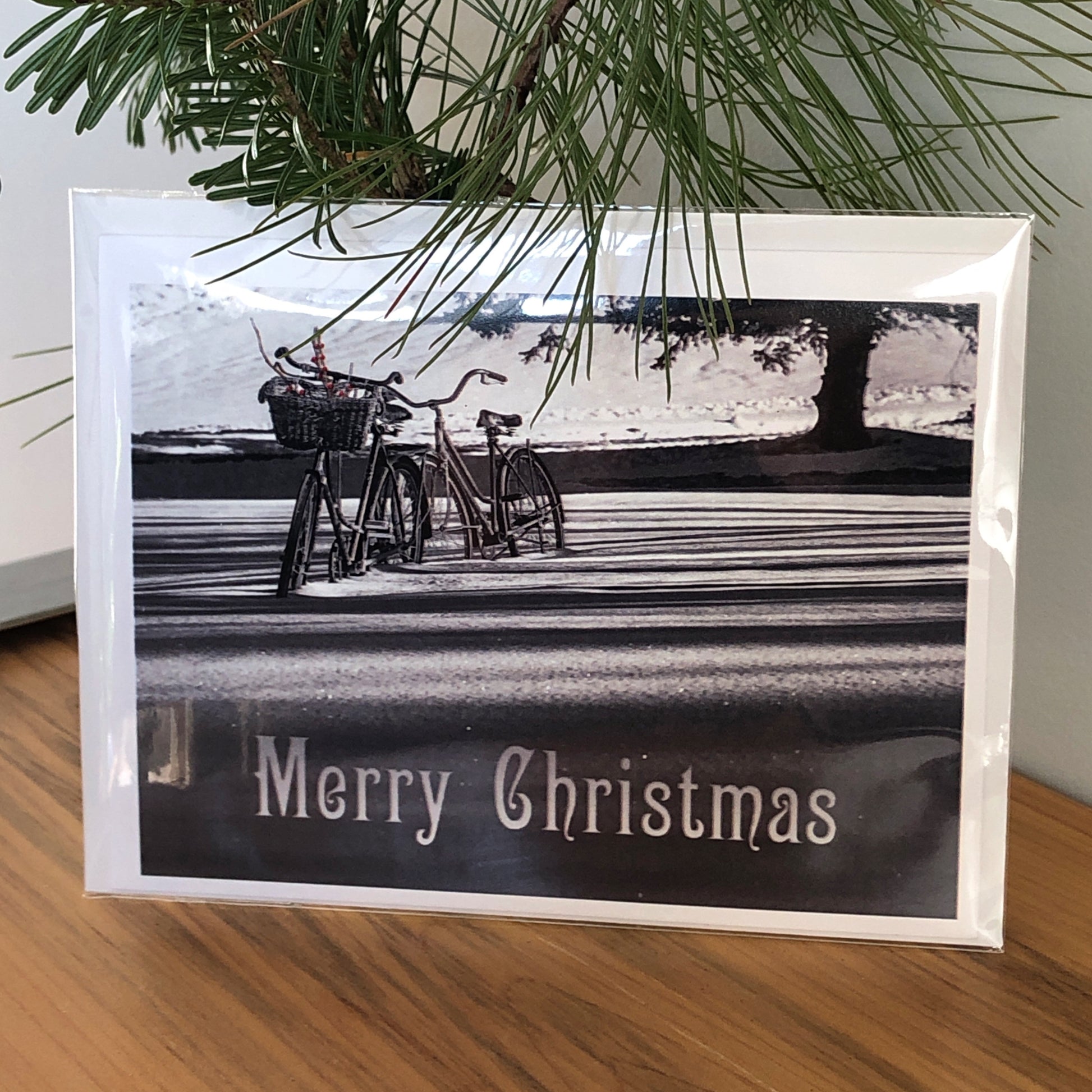 Our Christmas card for 2022 features an image captured by Mike Byrne of two vintage bicycles caught in the depth of winter with snow up to their axles. I imagined these bicycles were caught in a storm collecting while in search of the Canadian holly seen in the basket, then abandoned.