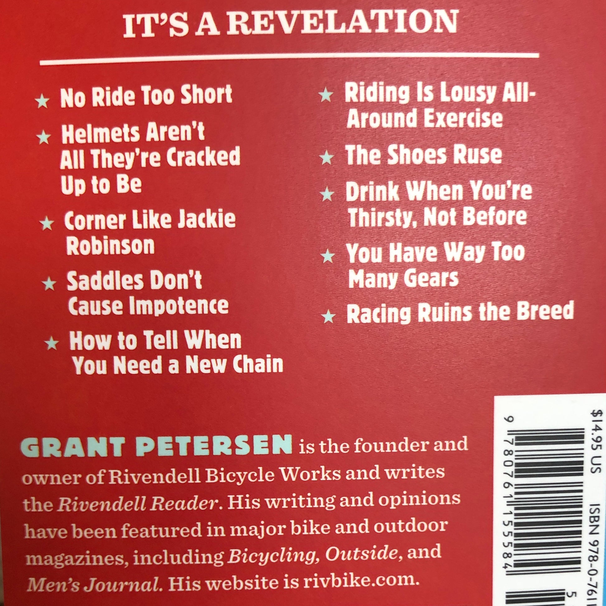 I think some people are intimidated by bicycling. They see brightly coloured road cyclists whizzing past and think this is the bench mark of cycling. It’s like we have been brainwashed to see the bicycle as an instrument of extreme fitness. Grant Peterson has the antidote in “Just Ride”.