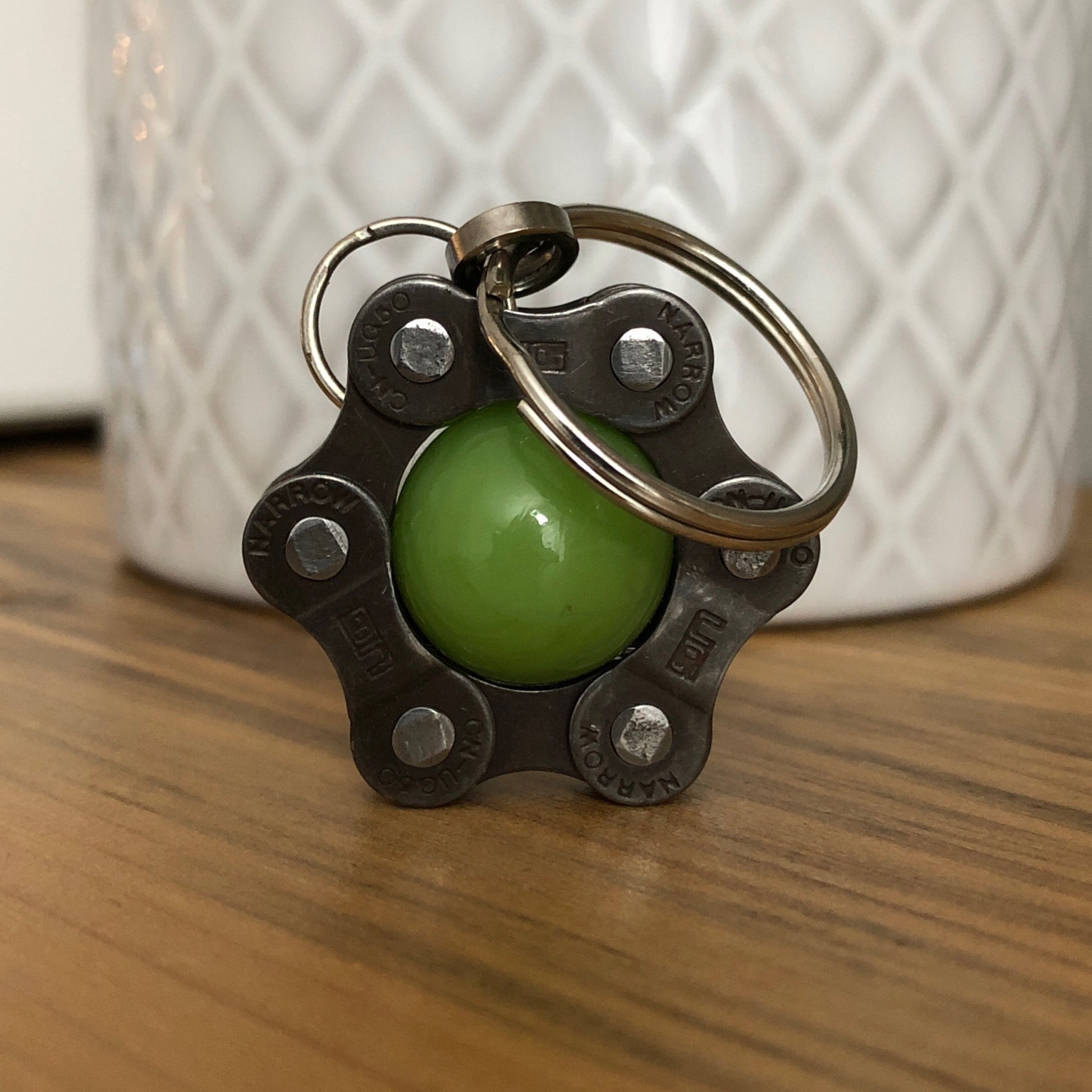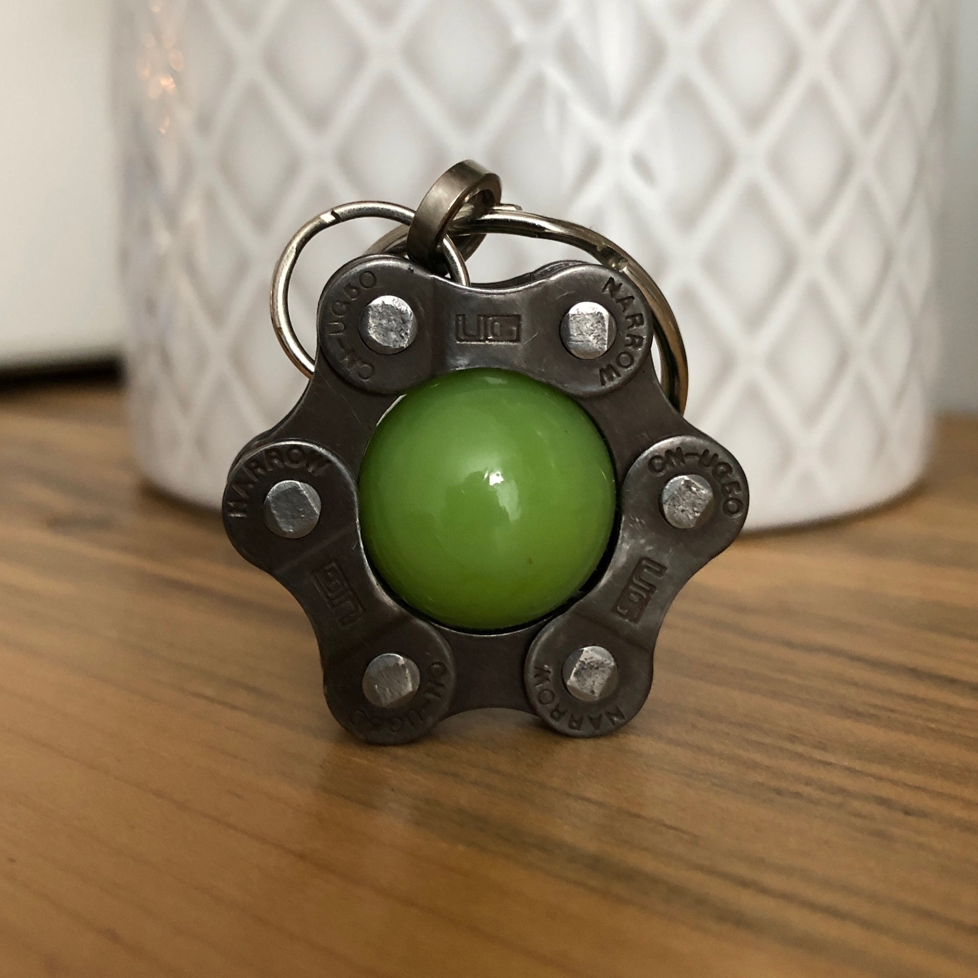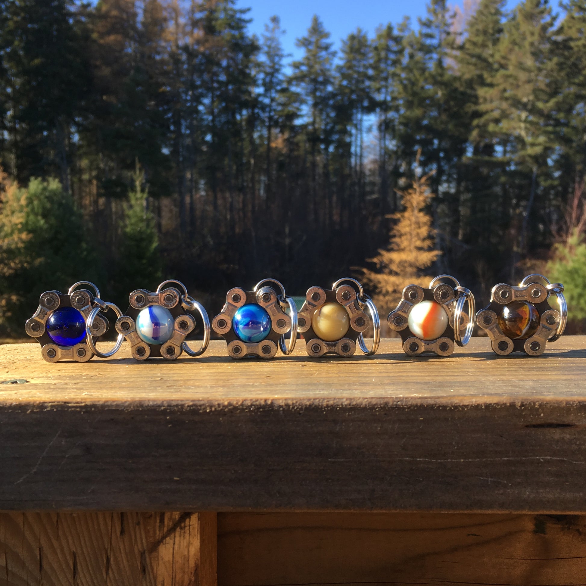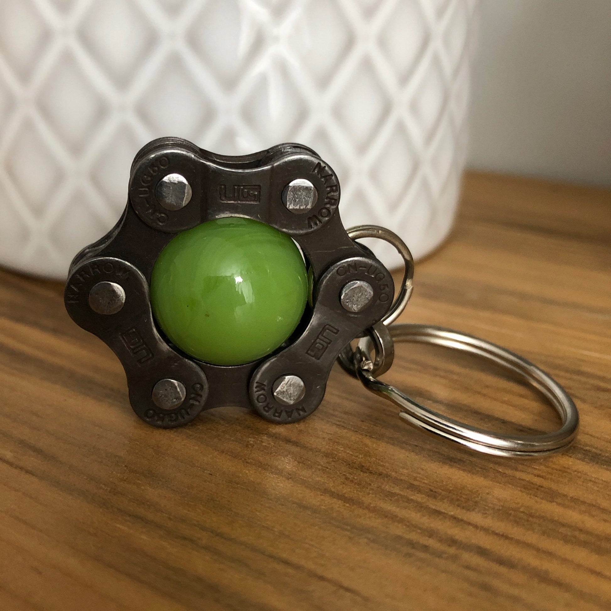 These are one of my favourite items! Each keychain is made from a length of recycled bicycle chain, a chain bushing and a small and large split ring (the large one for holding your keys). The focal point is a glass marble that fits tightly in the centre. The size of the marble prevents it from falling out. The chain will likely show some wear which only adds to the aesthetic of the item.
