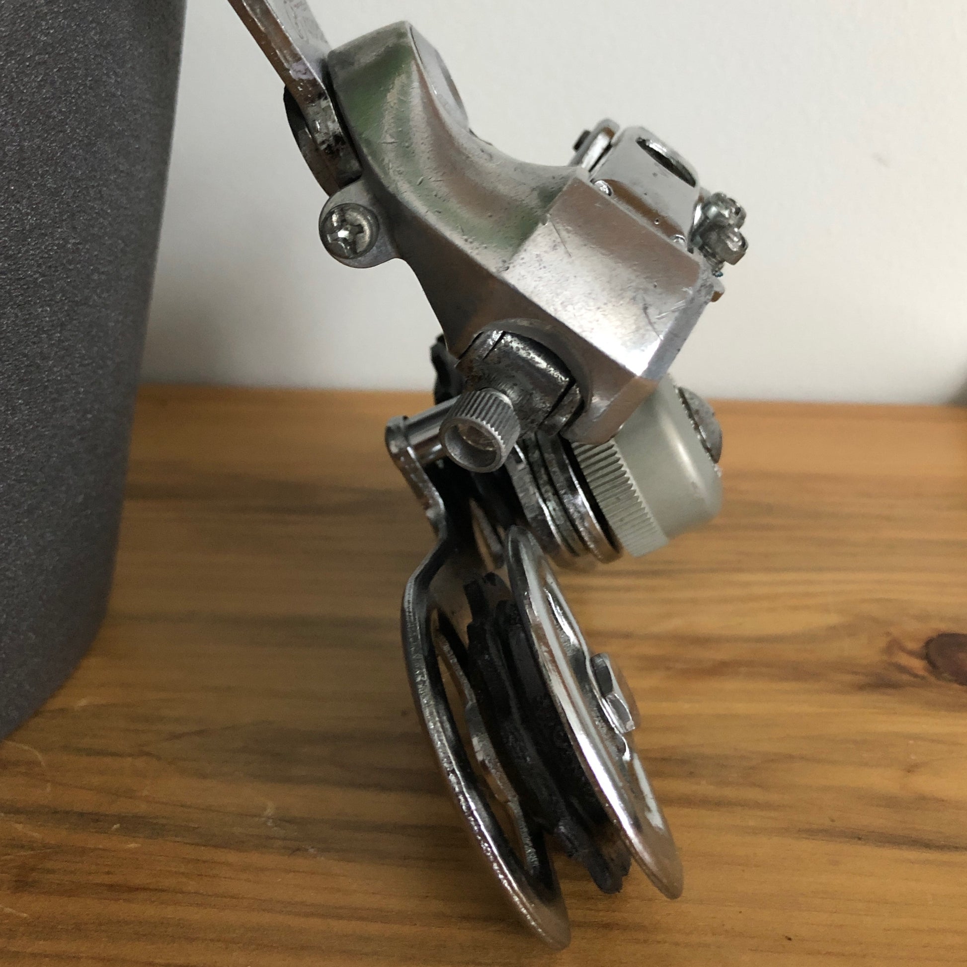 This Suntour aR Short Cage Rear Derailleur is in great condition both cosmetically and mechanically. All parts are original and there is only a few cosmetic blemishes. Spring tension and pulleys are in very good condition. The "Suntour aR" stencilling does not hold up to the strong water-based degreasing detergents and has been removed as a result.