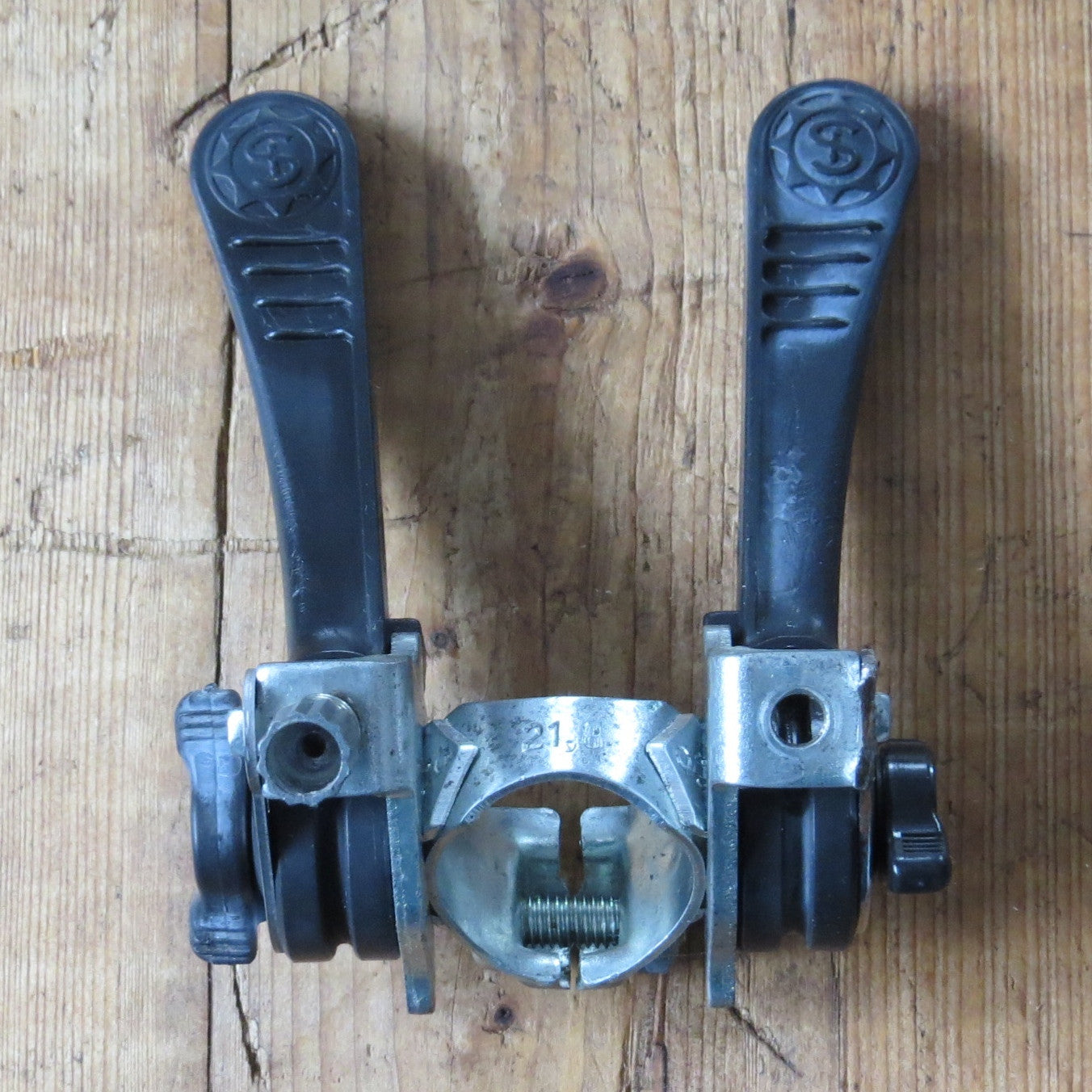 These shifters were taken off the same bicycle as the Sachs-Huret derailleurs listed below. The shift levers are black plastic with some fading. There is little to no rust on the metal clamp and parts. However one side plate (left) and cable tension barrel are damaged. The tension barrel is missing and the left side plate was replaced with a DIY Shimano by the original owner. Therefore, these are being sold "as is; for parts".
