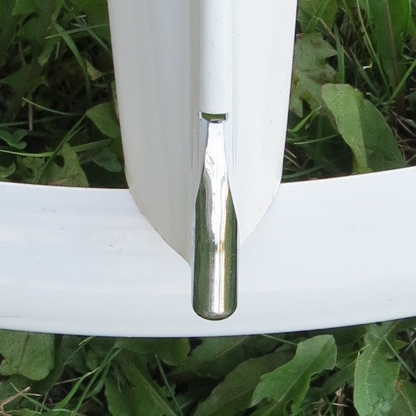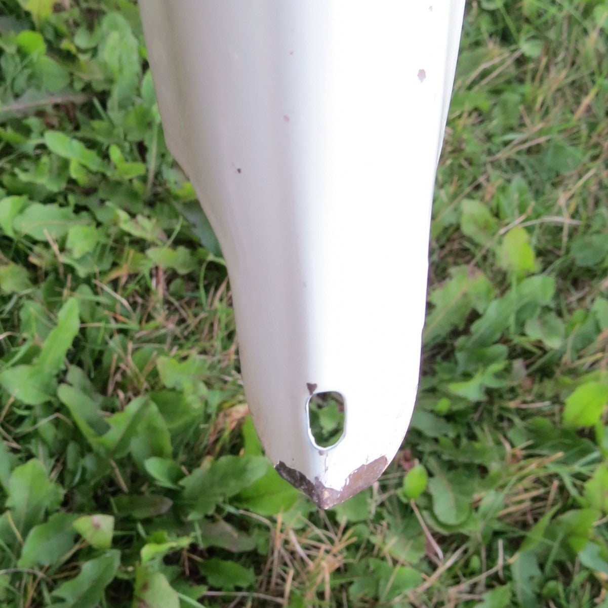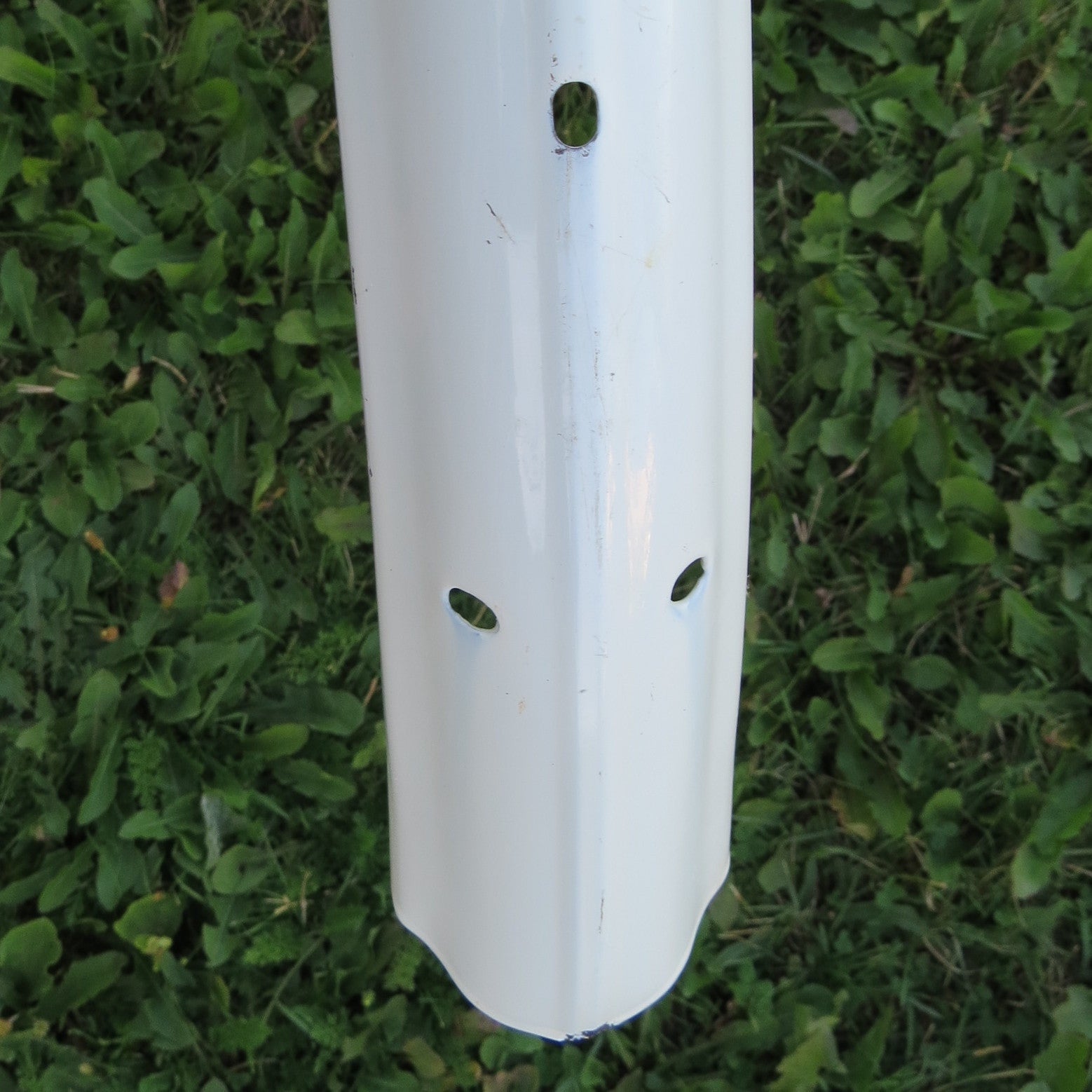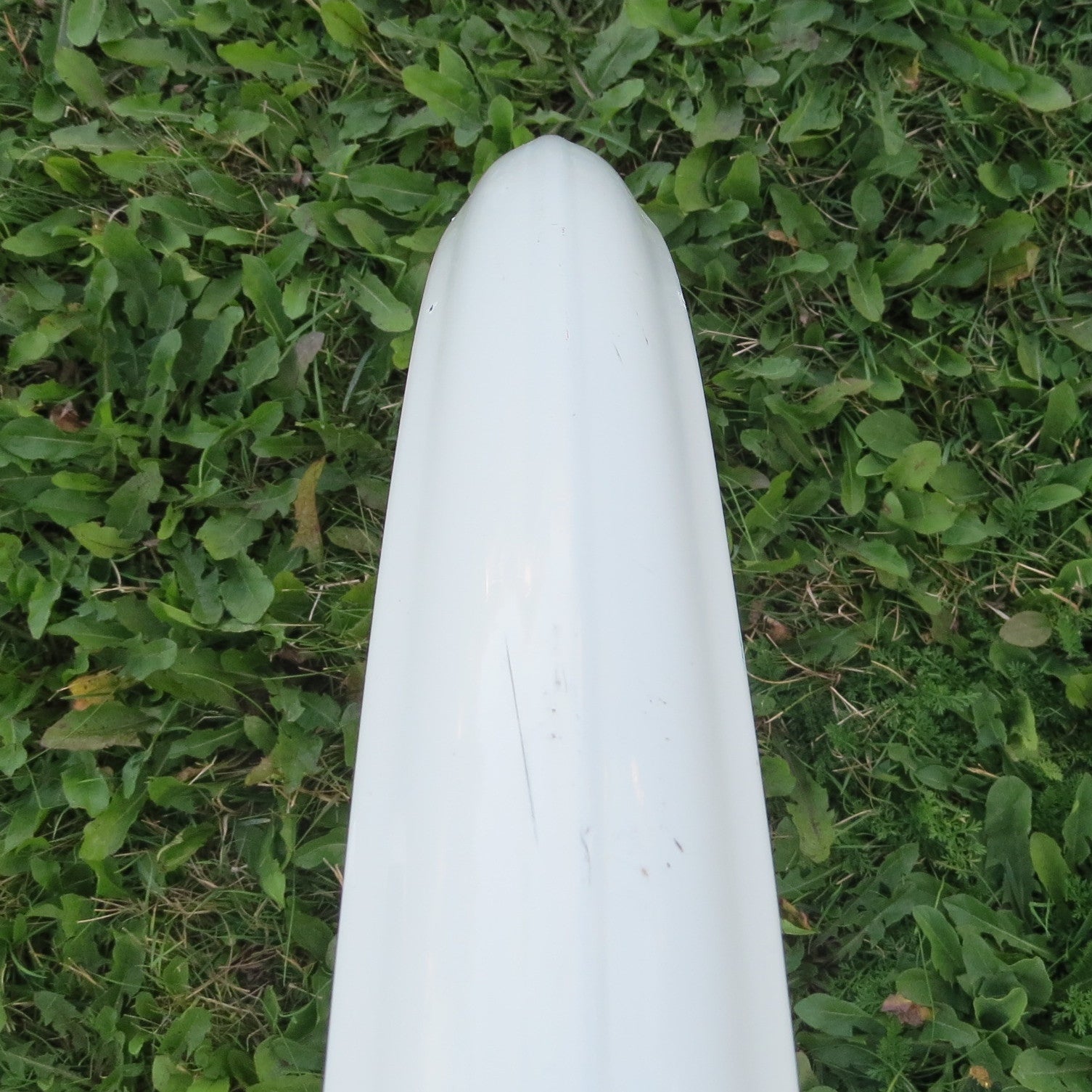 This is a NOS set of uninstalled vintage white bicycle fenders. I received them in the original paper wrap and since rewrapped them. They have a few chips from being knocked around for several decades but no rust or damage. I am not sure of the manufacture or intended bicycle. The front has a very nice chrome tip. They are drilled for stays and a rear reflector (not included). Look to be ideally suited for a 26 x 1 3/8 (590 - EA3) Canadian sized wheel and tire. Fenders only; not hardware or stays included. Shown in the photo are the various profiles and mounting holes. Also has a small bevel or chamfer where the front fender mounts beneath the fork crown.